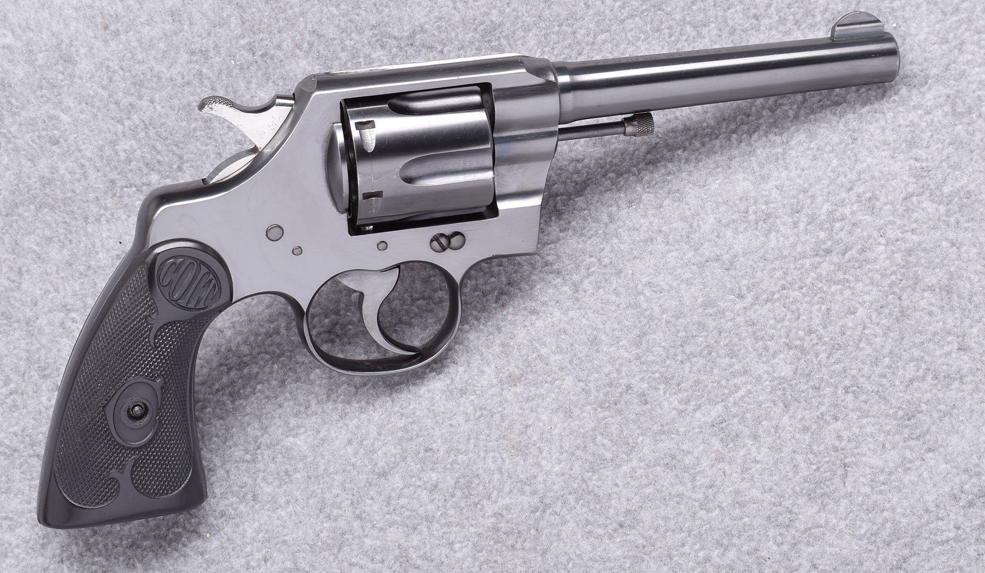 Polished blue, Colt gutta percha grips. Very high condition 1925 vintage Army Special shows only a few spots of oxidation. Includes proper but tattered box and papers.