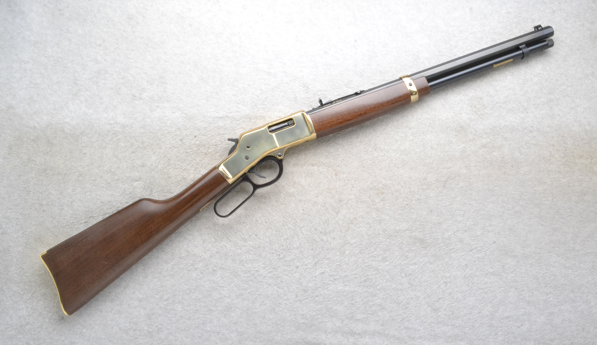 This Henry Lever Action Model is a right hand lever action repeating rifle in .45 Colt Cal. It has a 20 inch octagon barrel. A blade front sight with a brass bead and an adjustable notch middle sight. The butt stock is a smooth grip walnut straight grip. The forearm is a smooth grip walnut with a band. The barrel band, receiver and butt plate are all Brasslite.