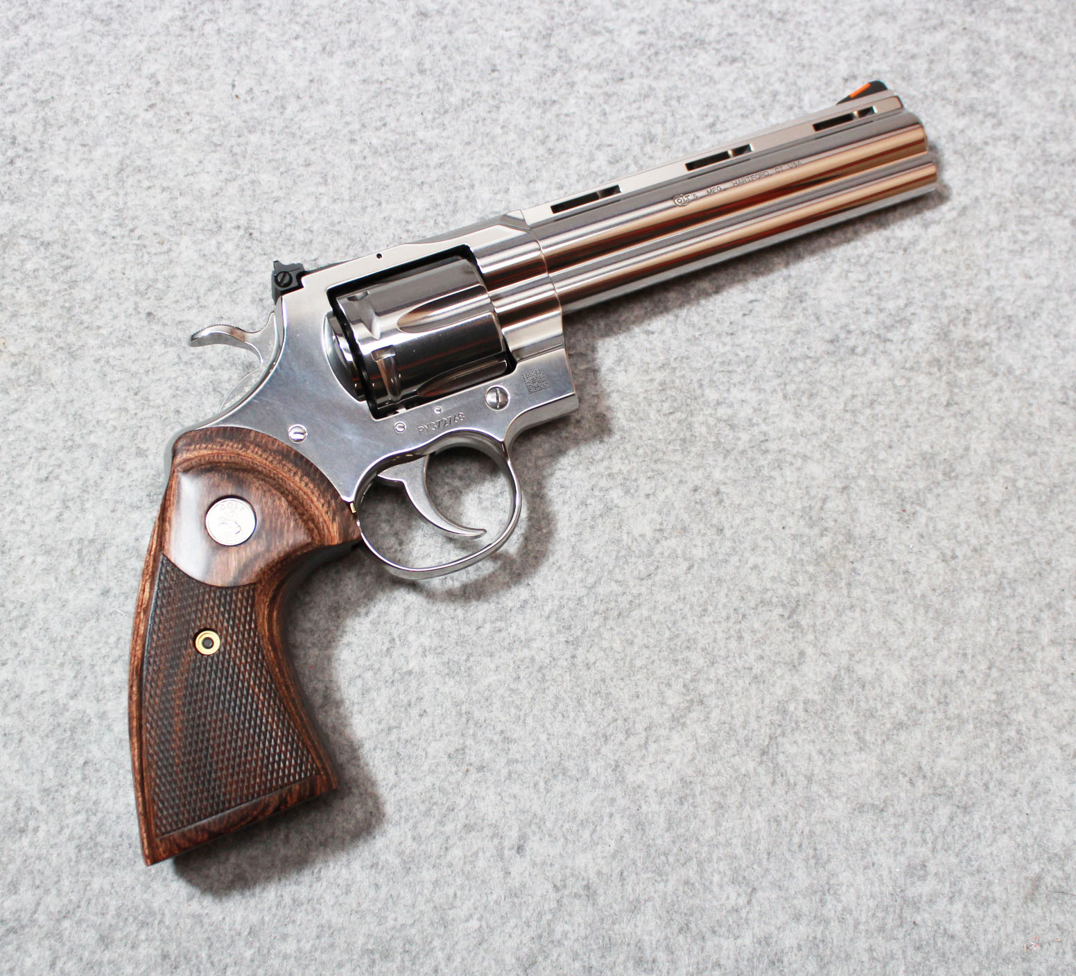 Colt Python, stainless steel double action revolver, chambered in .357 Magnum. It has a 6" vent rib barrel with full lug. The front sight is a black blade with orange insert, and the rear sight is a black adjustable u-notch. The factory target grips have silver Colt medallion inlays. Includes factory hard case, and manual. Free shipping to any Bass Pro Shops or Cabela's store.