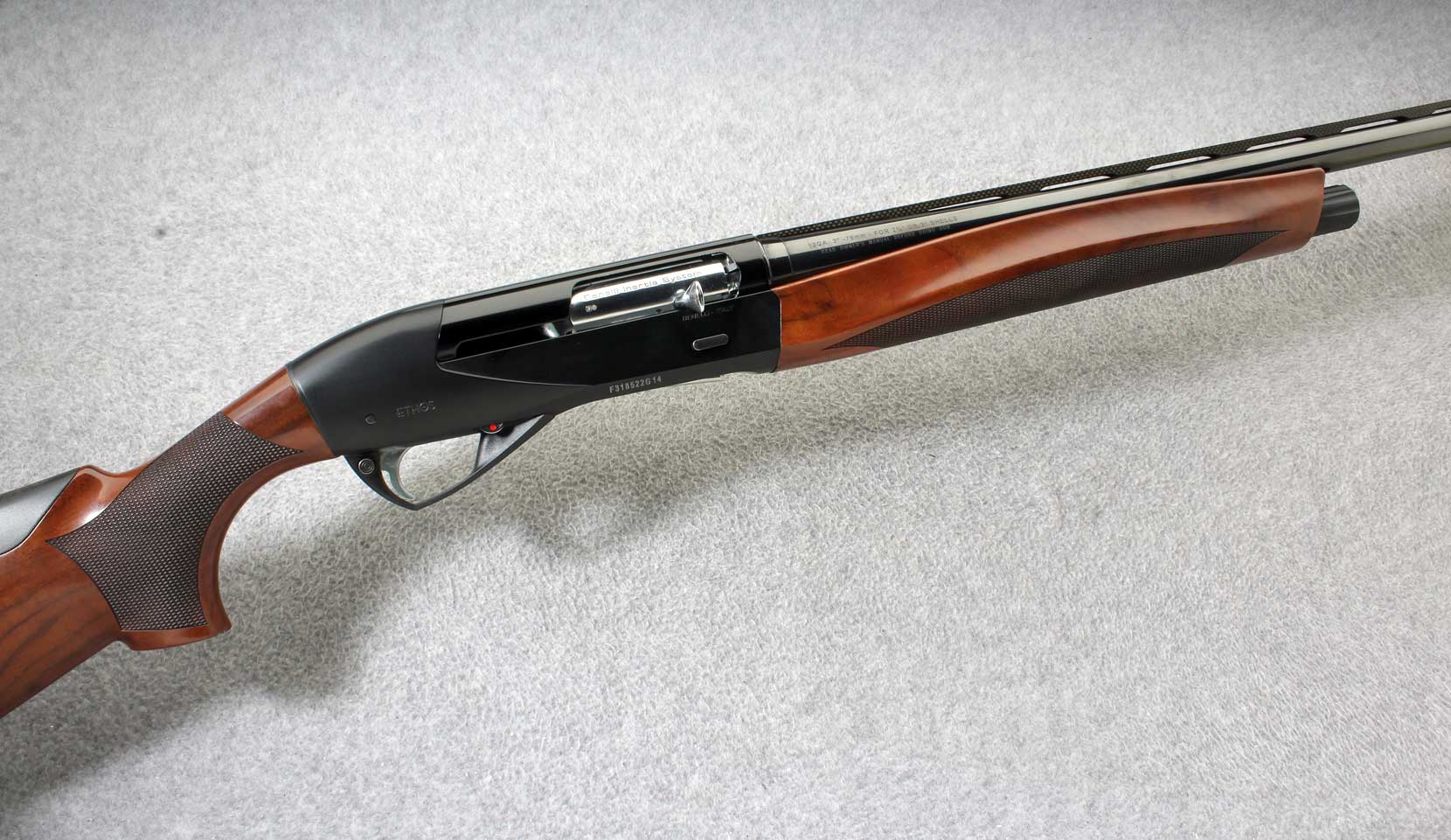 The Benelli® ETHOS Semi-Auto Shotgun shoulders in an instant and points naturally for a combination of reliability and performance, built around the proven Inertia Driven™ system. Clean, reliable, and adjustment-free, the Inertia Driven system cycles light field loads up to 3" magnums. The highly functional ETHOS comes embellished with elegant lines and features a beautifully figured AA-grade satin walnut stock and fore end. The carbon fiber ventilated rib comes with fiber optic front sights and metal bead mid-sight to provide an excellent sighting plane and rapid sight acquisition. Benelli manufactures ETHOS barrels with their Crio® System, which creates an even-grained, slick surface that results in less resistance against wads and shot for uniform shot patterns and cleaner barrels. Manufactured in Italy 2014.