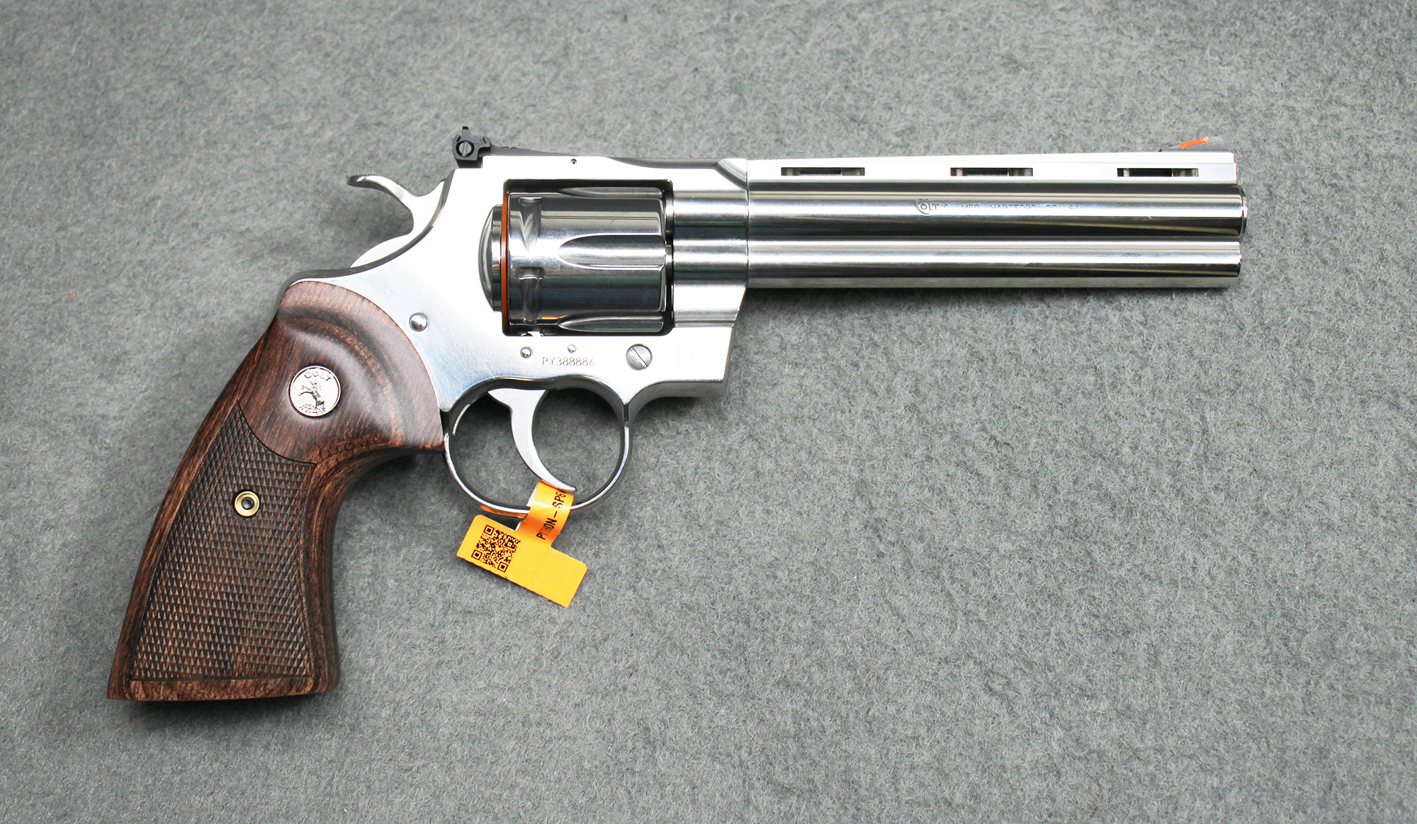 Factory New Blemished - Colt Python single/double action revolver chambered in .357 S&W Magnum. Stainless steel finish with 6-inch barrel. Comes in a factory hardcase with accessories. Please note: This firearm is being sold as used. It carries a 60-day factory warranty from the date of retail sale with regard to any mechanical defects. However, it is being sold "As Is" with regard to any wear marks or other cosmetic blemishes.