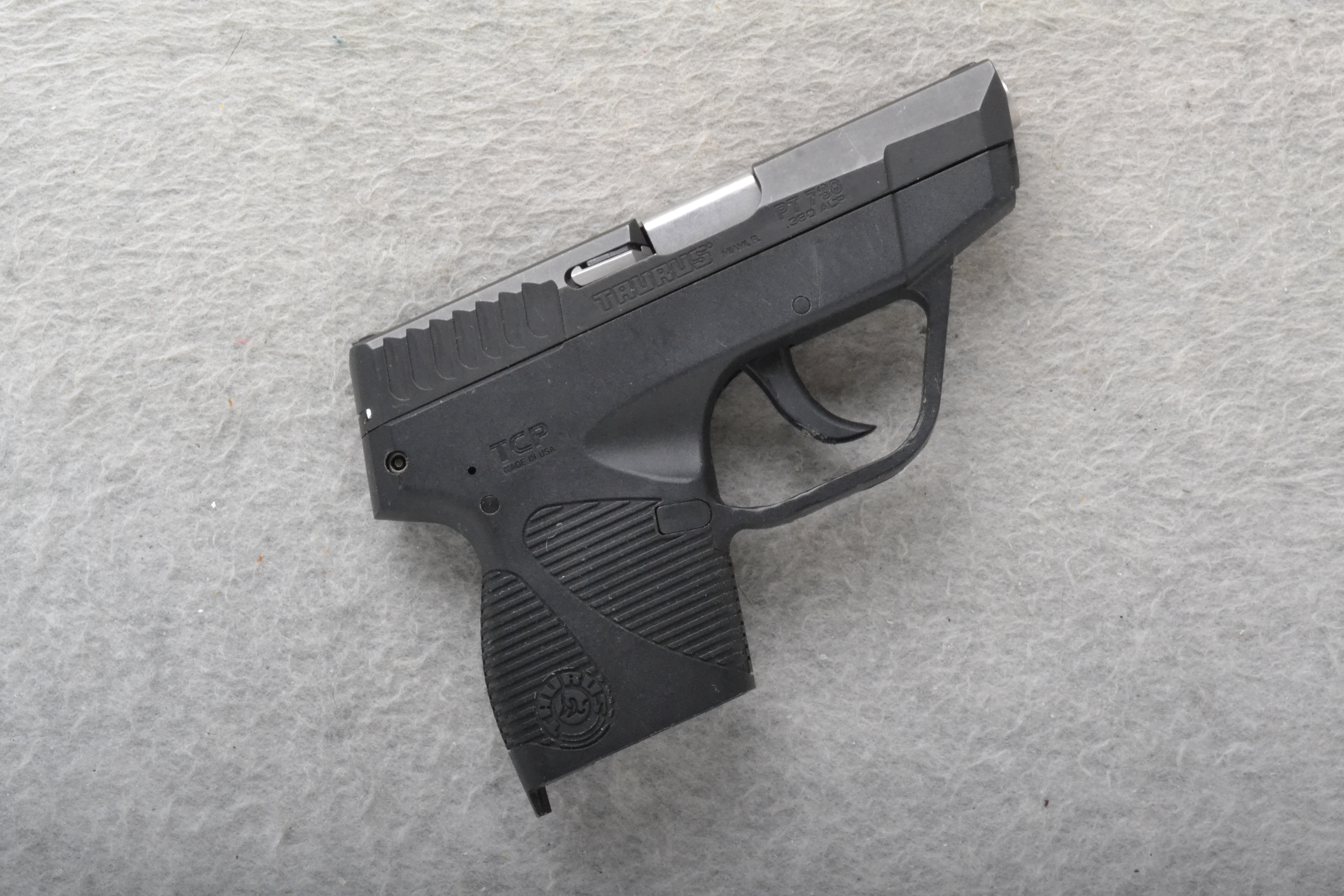 This Taurus PT738 is a right-hand semi-auto pistol in .380 ACP Cal. The barrel is 2.75 inches long. It has rear cocking serrations. It has a fixed bar front sight, and a fixed notch rear sight. The pistol grip is grooved polymer with a thumb and finger rest. It does not come with a magazine.
