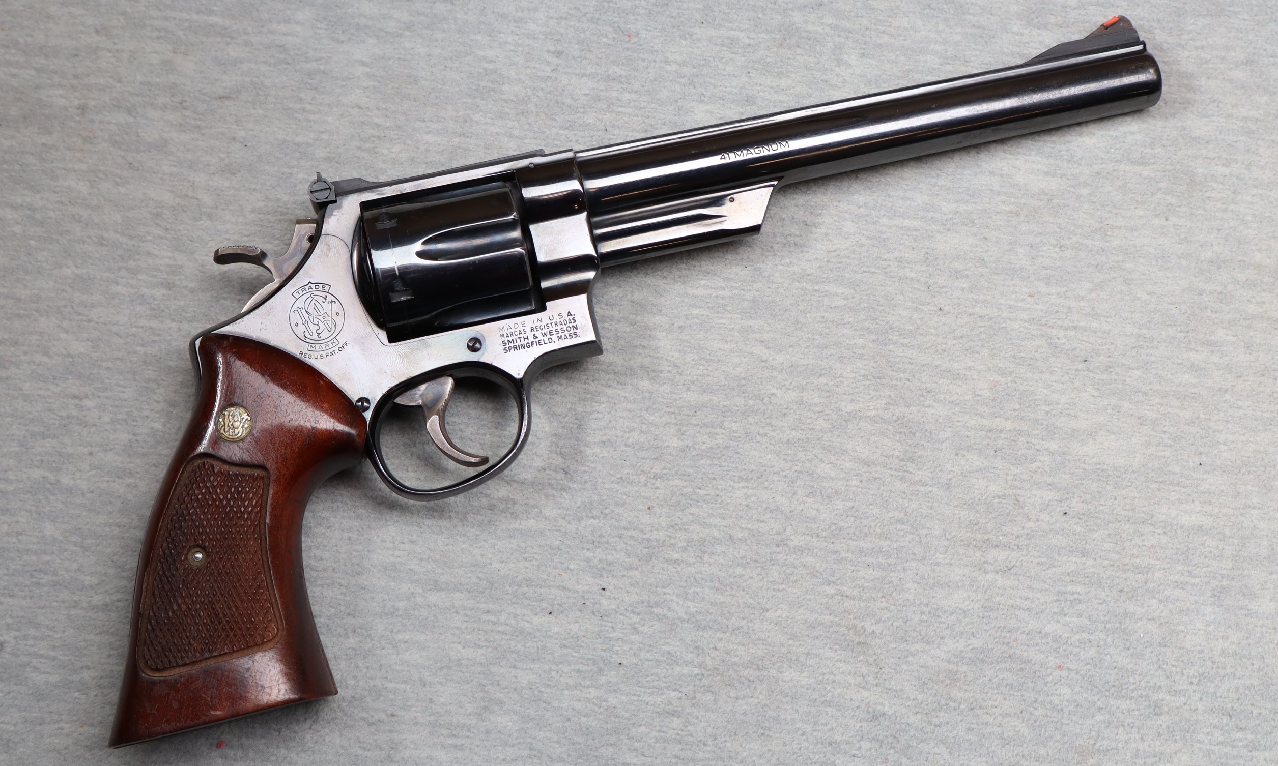 Excellent condition, light finish wear, few small scratches, comes with wood presentation box. S&W .41 Magnum revolver, 8 3/8" pinned barrel with shrouded ejector, polished blue finish, wide target trigger & hammer, adjustable sights, 6 shot fluted cylinder, checkered hammer & cylinder latch, and S&W checkered wood target grips.
