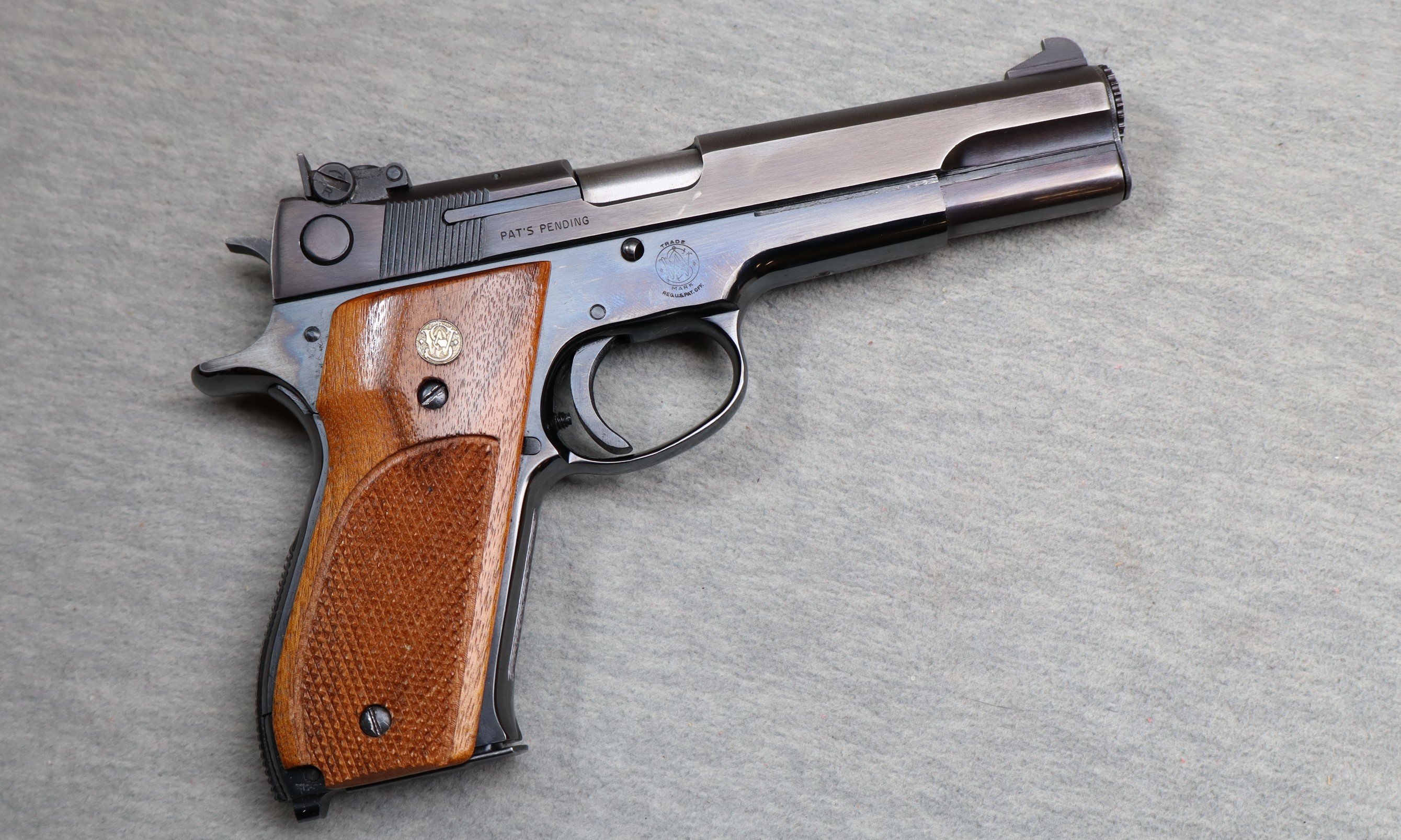 Excellent condition, light finish wear, small scratches, comes with three mags and original box. Classic S&W semi auto .38 Special target pistol. 5" barrel, polished blue finish, adjustable target sights, crisp trigger, extended beavertail, serrated front & checkered rear grip frame. With S&W checkered wood grips.