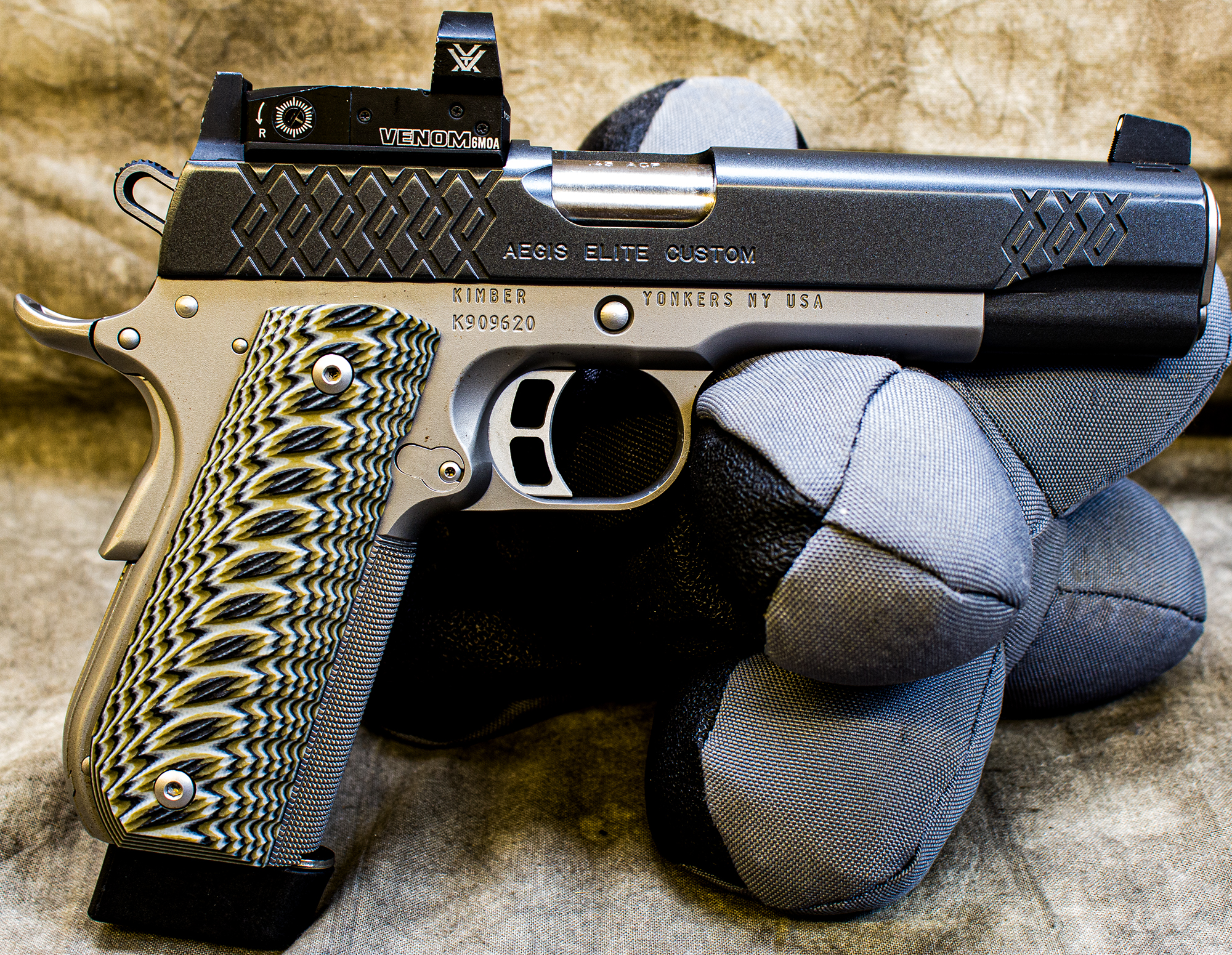 The Kimber Aegis Elite Custom 1911 has rounded heel frames and two-tone styling completed with G-10 Cyclone patterned grips to make these standout in any environment. AEX pattern serrations are a stylish answer to the practical need for grip surface during reloads. The Aegis Elite features green and red fiber optic sights for a bright, clear sight picture. Remaining true to Kimber's original purpose, the Aegis Elite Custom puts an otherwise custom gun within the reach of every shooter's hands. This pistol includes a Vortex Venom red dot sight. Features: G10 grips Matte black, KimPro II slide finish Stainless steel frame with a satin silver finish Full-length guide rod Round heel frame