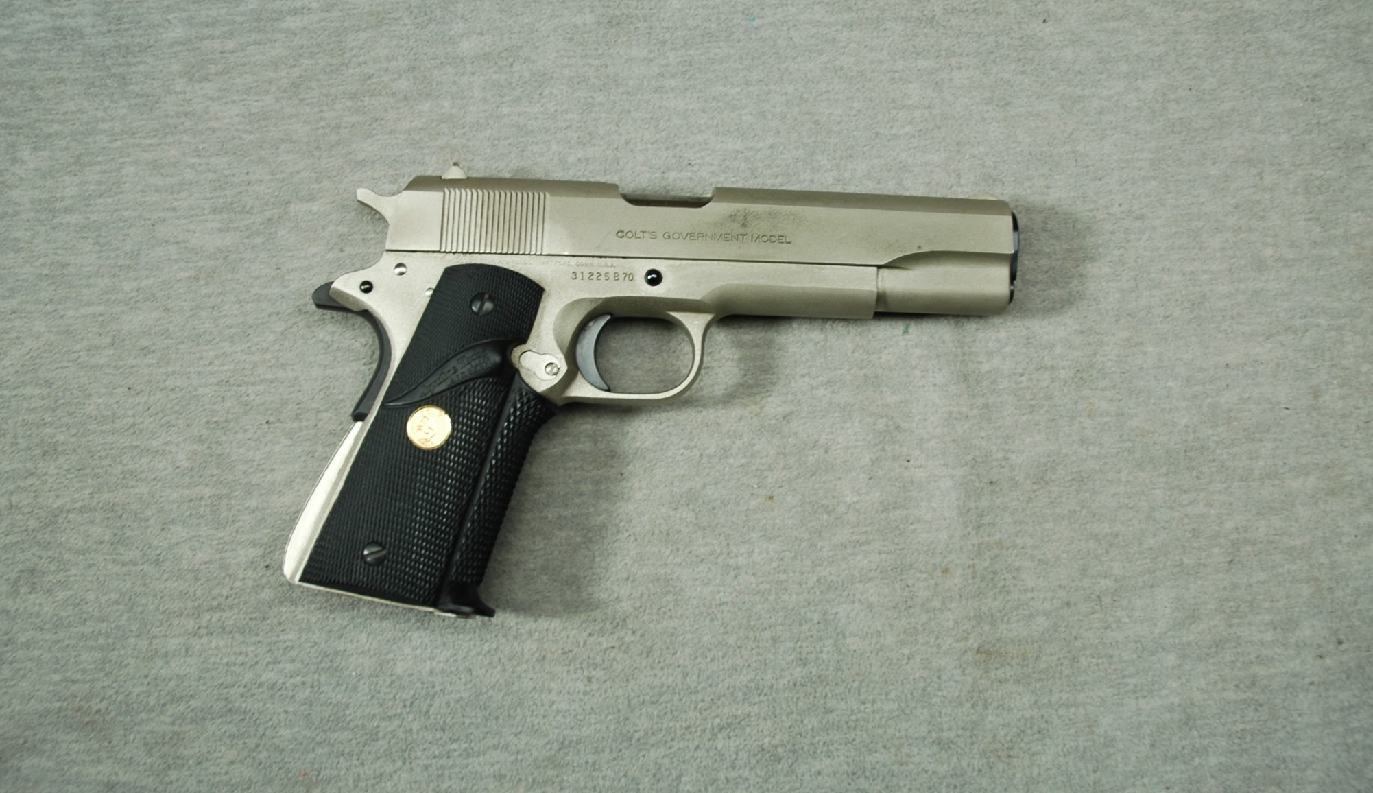 Colt Government MK IV Series 70 chambered in .45 ACP. This is a single action semi-automatic pistol fed by a detachable magazine. It has a 5-inch barrel, front blade sight, and a fixed rear notch sight. The grips are rubber Pachmayr with a gold-colored Colt medallions. The pistol has a matte stainless finish. Includes 1 mag.