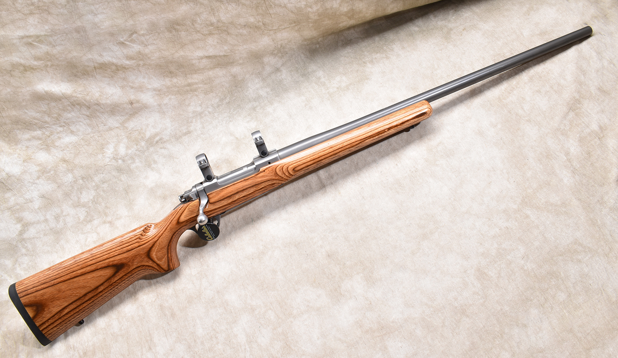 This varmint rifle features a heavy, 3/4 inch diameter barrel, heavy laminated hardwood stock, and internal magazine with hinged floor plate. The S/N traces to 2000.