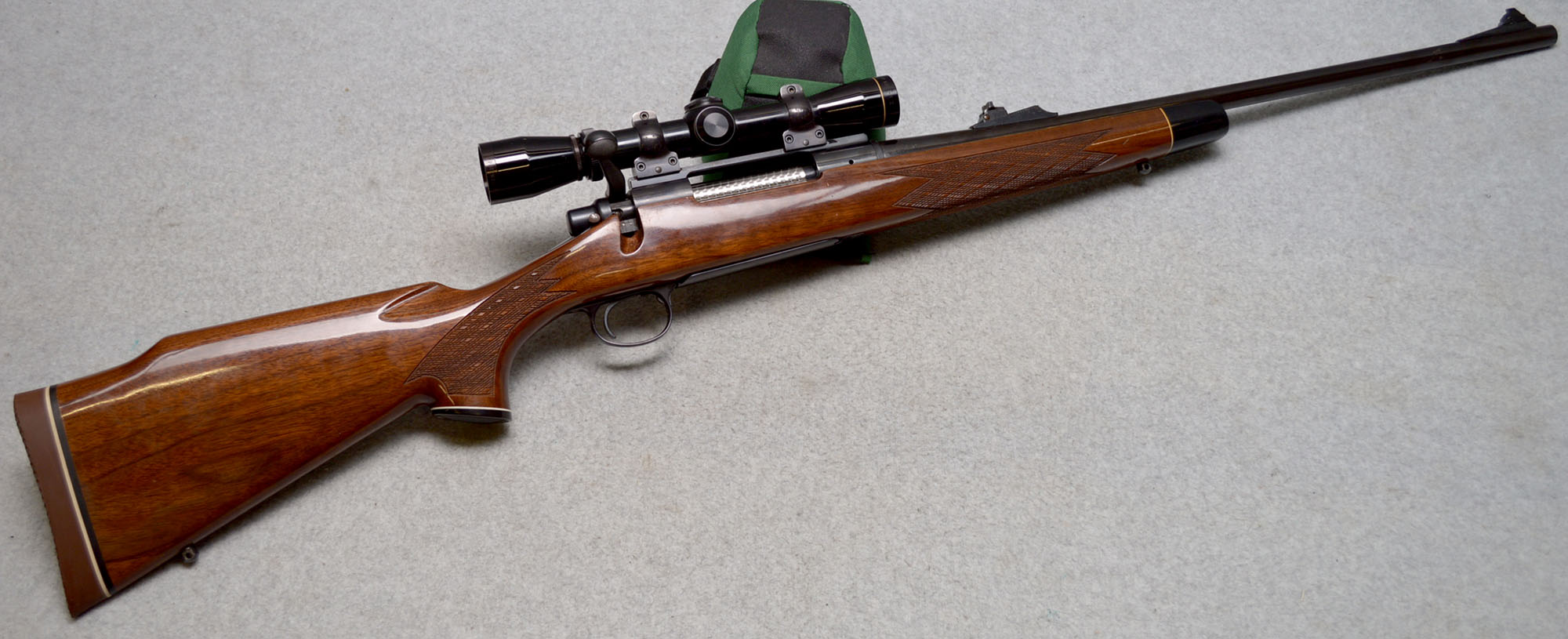 Good condition. Bore is bright and shiny, and the bolt action runs smooth. Stock has some slight handling wear. Including the toe of the stock being repaired, and some light varnish wear around the recoil pad and butt of the stock. Firearm has freckling / surface rust throughout - sparse freckling on the receiver, while the barrel, rear sight, scope rings, and safety have moderate to heavy freckling. This Remington Model 700 BDL was manufactured in Jan. of 1981, via Remington's barrel date code "BB". Featuring a 22" barrel, drilled & tapped receiver, jeweled bolt, internal magazine well with a hinged floor plate, bladed front sight and rear elevation sight, manual safety, sling studs, and has a checkered walnut stock with a basket weave Pachmayr recoil pad. Comes with the preinstalled Leupold Vari-X II 2x7 Scope mounted with quick detach rings.