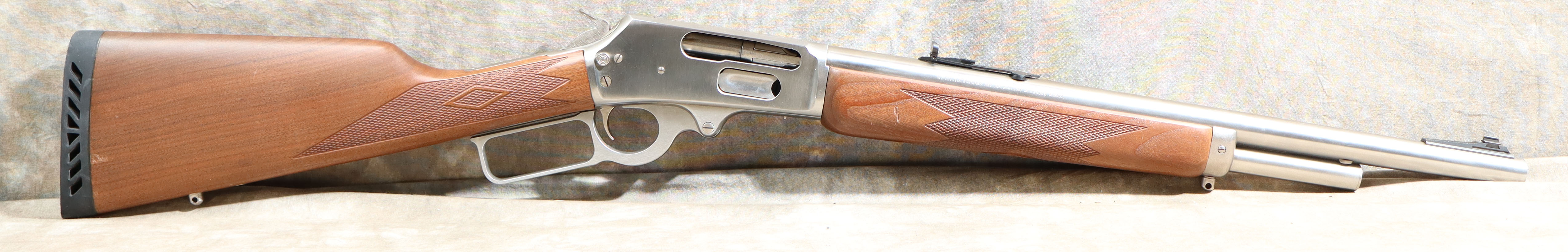 This Marlin 1895GS Guide Gun is a 45-70 Gov't lever-action rifle featuring stainless steel construction for corrosion resistance, an 18.5-inch barrel with Ballard-type rifling, and a straight-grip American black walnut stock. It is a compact, 7-pound rifle designed for big game hunting and dangerous game defense, holding 4+1 rounds. This would be a great add for your collection and make for a great day at the range or hunting.