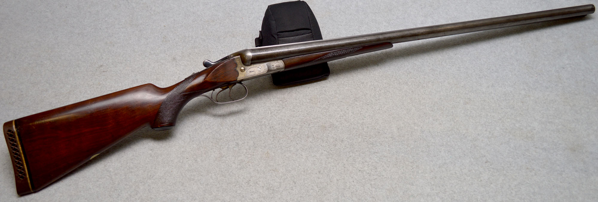 SERIAL NUMBER: 393687 BARREL: 28 3/8" ( .675 BOTH BARRELS) CALIBER: 12 GA. 2 3/4" SHELLS. MANUFACTURED: 1910 - 1920. Metal has blue finished barrels with bead front sight Receiver has case color and is engraved with side lock action. Double triggers and blue finished trigger guard. Walnut stock and forend with checkering and aftermarket White Line butt pad. L.O.P. is 15" CONDITION: Metal has 50% finish remaining with heavy wear from use and surface freckling. Wood is very good with handling marks and wear from use. Bore's are frosted