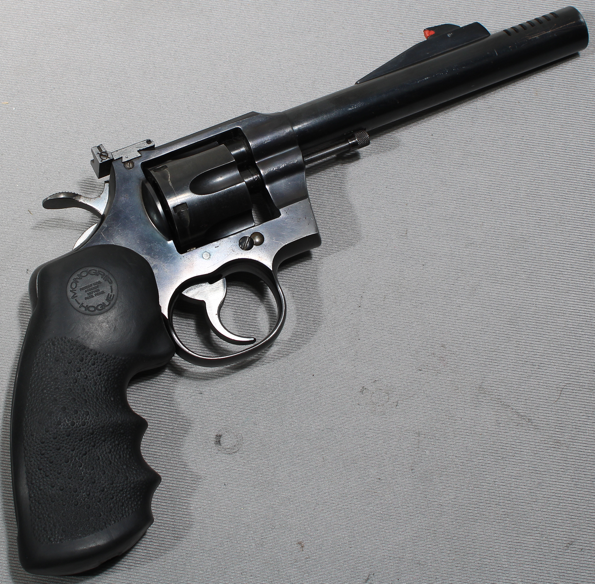 A Colt revolver chambered for .38 Special, wadcutter rounds only. The revolver is in good condition, but does show some wear from general use on the barrel and frame including scratches on either side of the muzzle and wear marks from the ejector rod knurling rubbing against the barrel. Gun Only