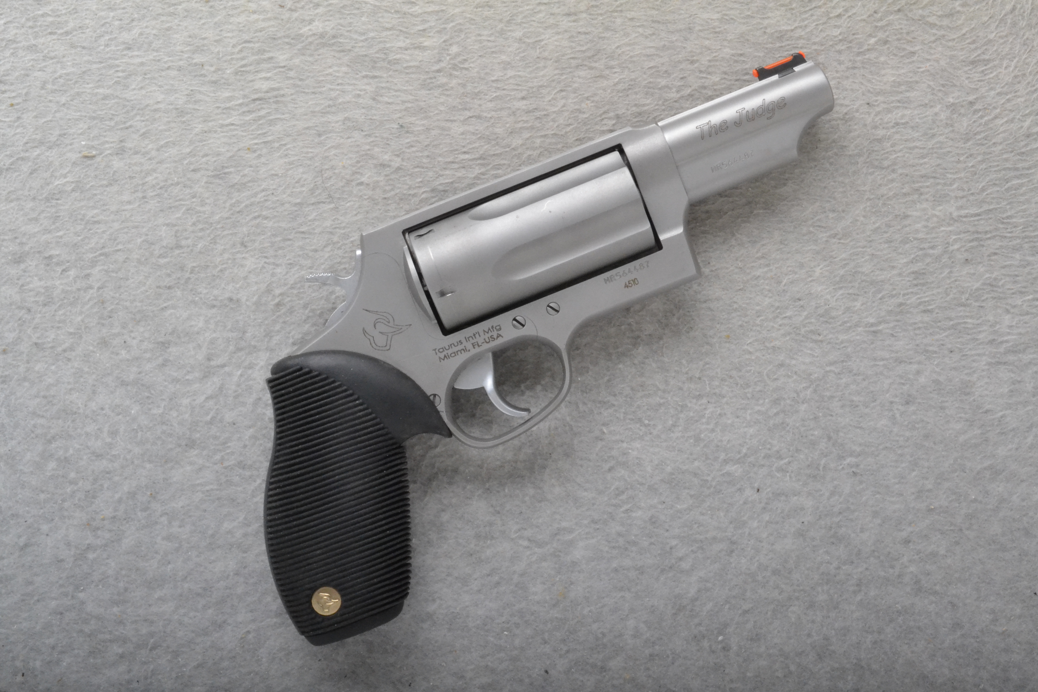 This Taurus The Judge is a right-hand double action revolver pistol in .45 LC / 410 bore Cal. The barrel is 3 inches long. It has a fixed bar orange fiber optic front sight and an integral notch rear sight. The pistol is grooved rubber. It includes a box.