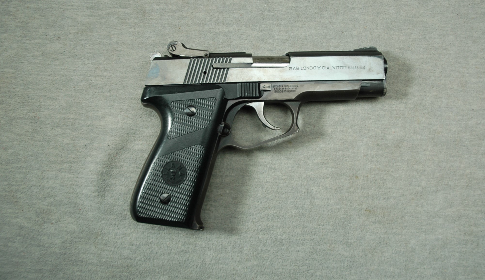 Llama Omni chambered in .45 ACP. Imported by the Stoeger Company, from 1982 to 1986. It is an old-style all-steel construction, with high-polish European blue on the side surfaces. The single-stack mag holds seven rounds. It has an internal automatic firing-pin-block cleared only with a complete trigger pull. When turned down to "on-safe" the manual safety does not drop the hammer. It blocks both the hammer and the firing pin. There's no magazine-disconnect safety. The trigger is wide and smooth-faced. The trigger pulls are excellent though. Single-action is a crisp 4-lb. average, and DA a super-smooth 8 lbs. The square-picture sights are plain, with no white dots. The rear sight is fully adjustable, and the front sight is ramped. The top of the slide is matte finished, so no glare. No box and 1 mag.