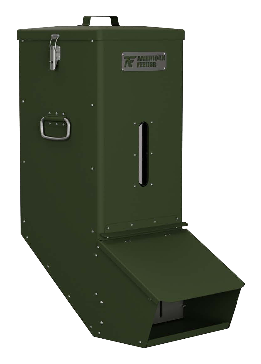 The American Feeder GF-80 Gravity Feeder provides a consistent feed source with a reliable, gravity-based design. This all-aluminum, lightweight, rustproof deer feeder is packed with the features that count. It includes mounting straps, so it can be installed on trees and posts. An included T-post mounting bracket allows for even more mounting options. The GF-80 from American Feeder has a mineral brick holder on its side, so you can attract even more local deer and give them essential minerals. A hinged, single-piece lid makes fill-ups easy, and a feed sight glass lets you know the feed level inside of this game feeder. Built-in handles allow for easy portability. Weight: 10 lbs. Capacity: 80 lbs. of deer corn. 28.56"H x 13.5"W x 21.87"D.