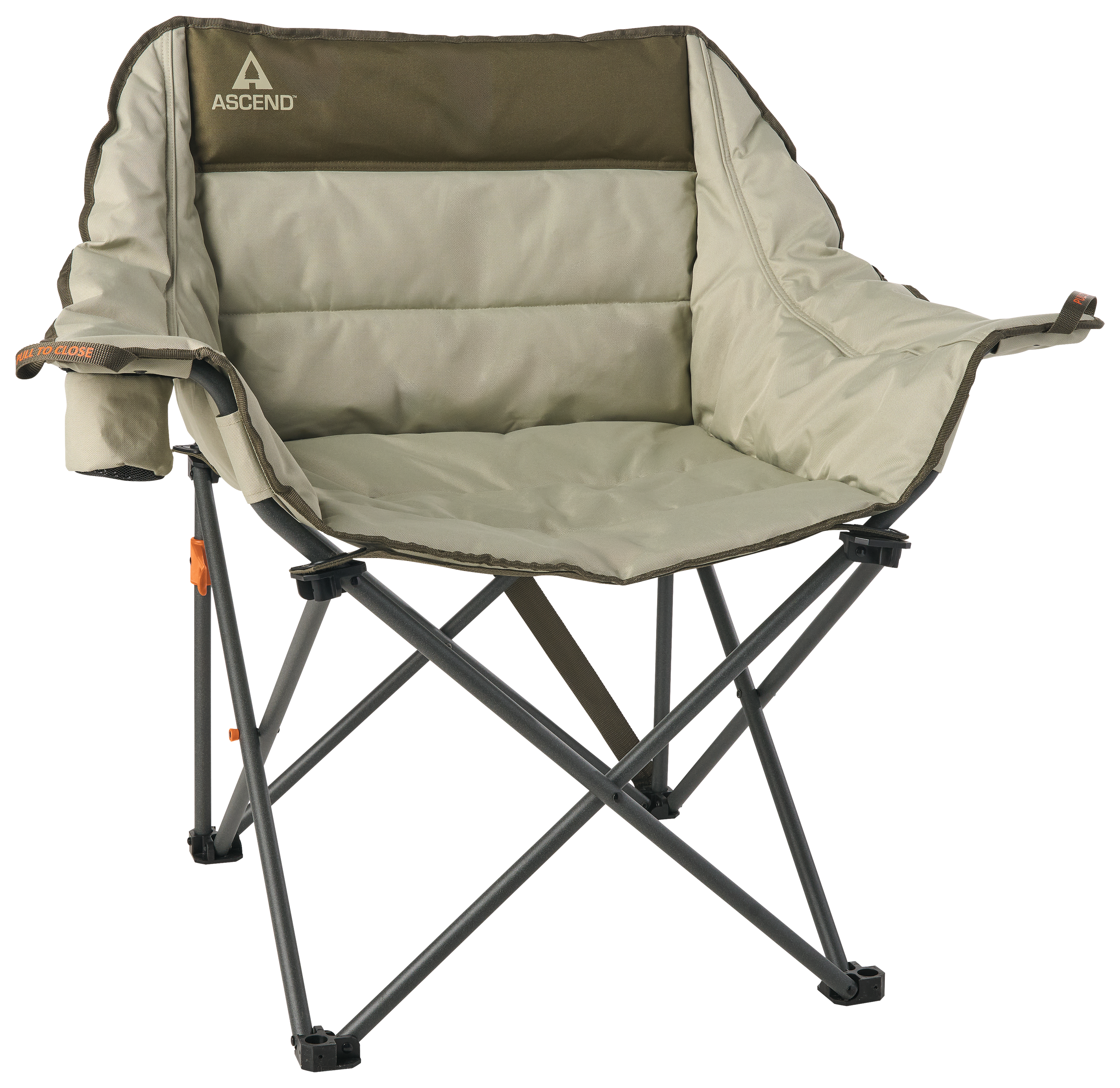 Be comfortable wherever your outdoor adventures take you in the Ascend® Traveler Padded Chair. Made of a water-resistant polyester, this folding camp chair features fully padded and cushioned armrests, back, and seat to boost comfort. Built on a sturdy powder-coated steel frame, this folding design features the Ascend QuickLock molded latch and easy-close handles for easier folding. Integrated carry strap makes hauling this comfy, go-anywhere chair from the campsite to the sidelines to the backyard a breeze. Built-in cup holder. Includes zip carry bag for easier transport and storage.