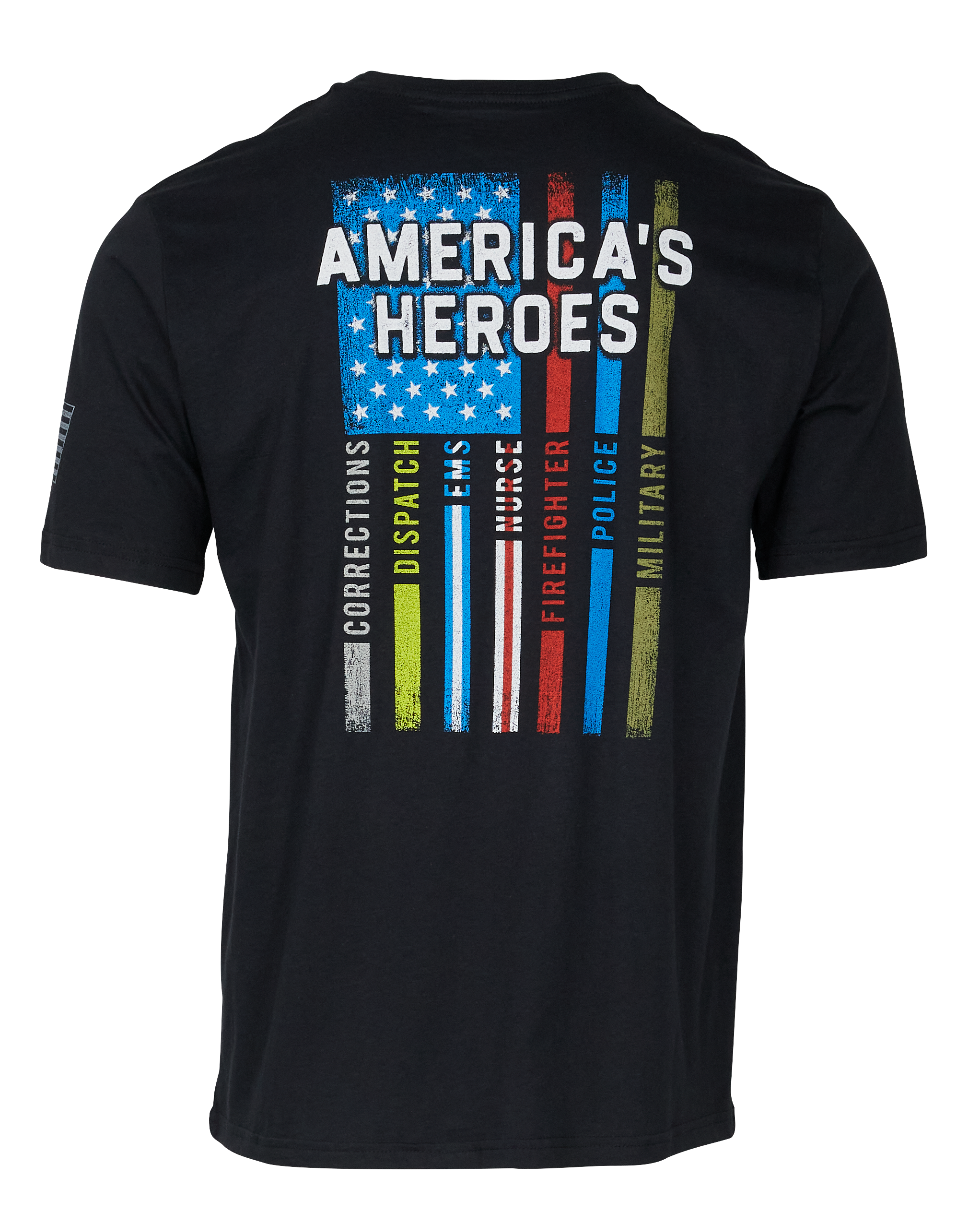 Wear the Bass Pro Shops® America's Heroes Short-Sleeve T-Shirt for Men and celebrate the Americans who put themselves in harm's way to keep you safe and secure. Colorful back graphic shows off a stylized American flag adorned with all kinds of heroes. This lightweight and soft men's shirt from Bass Pro Shops features set-in sleeves, straight hem, and ribbing on the cuffs, hem, and crew-neck collar. Made of 100% cotton. Machine wash. Imported.