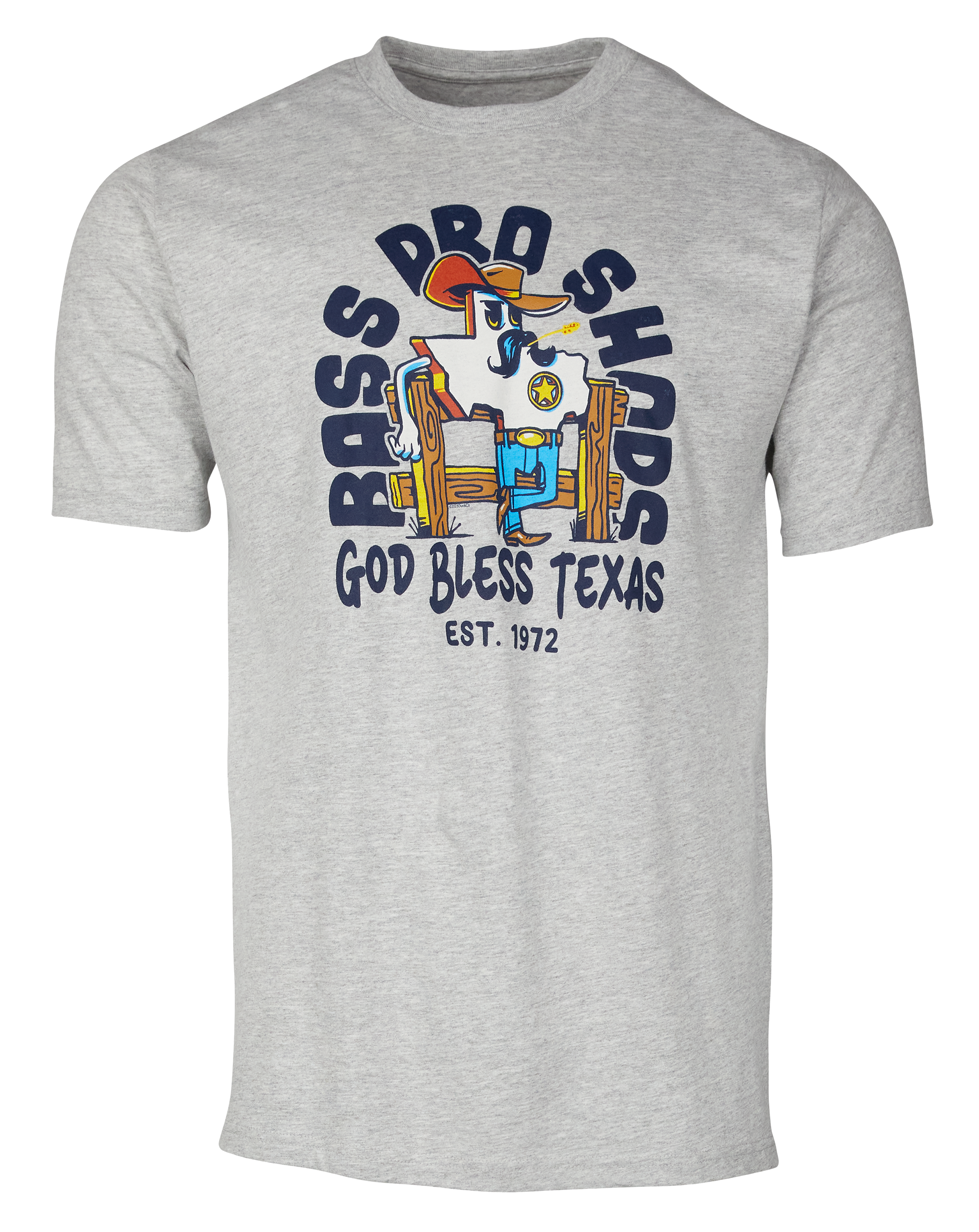 Enjoy a little light-hearted Texas pride with our Bass Pro Shops® God Bless Texas Short-Sleeve T-Shirt for Men. Made from 93% cotton/7% polyester, this men's shirt is soft, breathable, and durable. The large chest graphic provides a whimsical look at Texas imagined as a lawman. Finished with a ribbed crew neck. Machine wash. Imported.