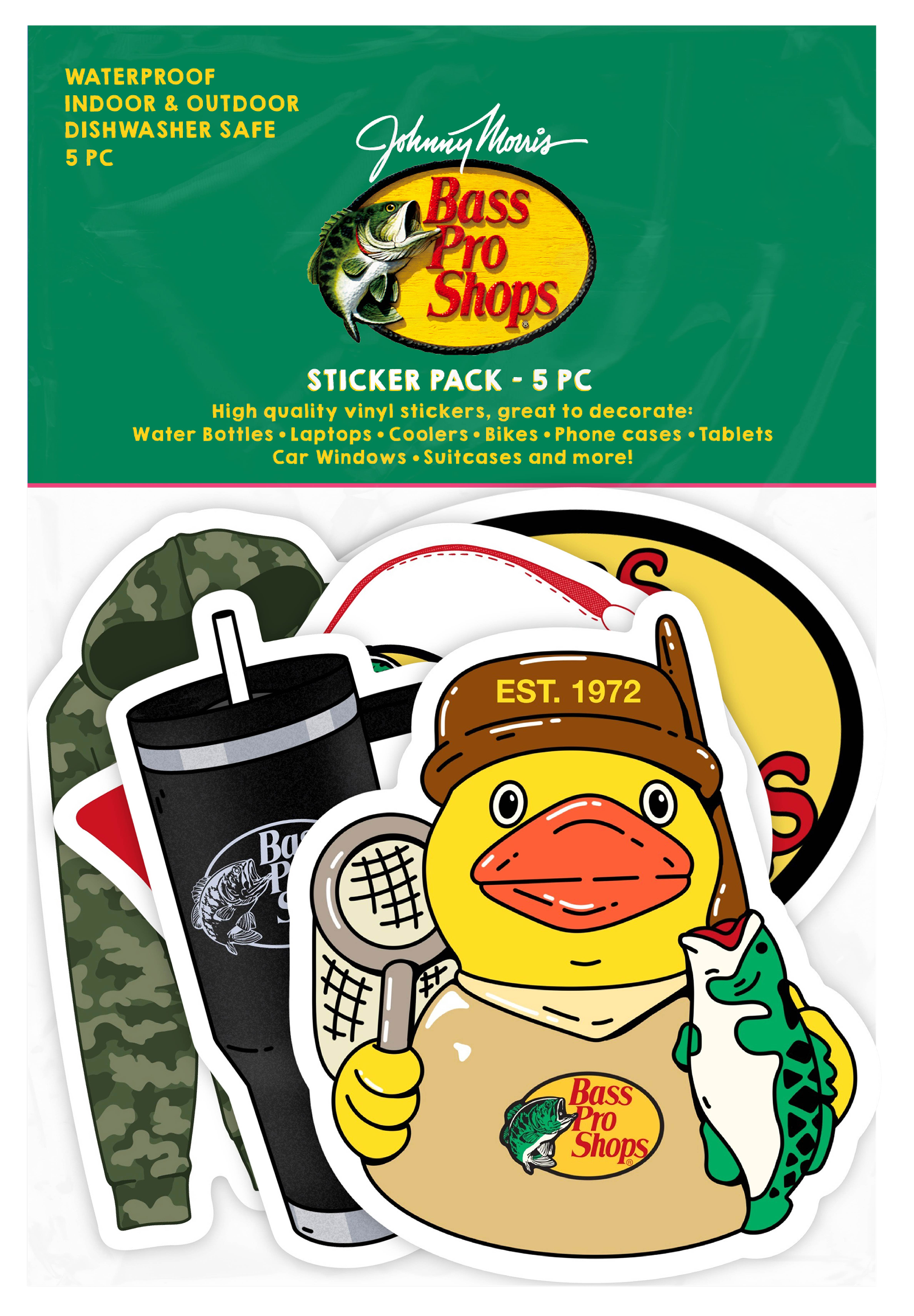 Outfit your gear with our Bass Pro Shops® Logo 5-Piece Sticker Pack! Each one features an iconic design that showcases the leaping-bass logo, and you'll get a logo, a sweatshirt, a cap, a tumbler, and a rubber duck in our branded gear. Durable, waterproof vinyl decals ensure lasting enjoyment. Dishwasher-safe. 6"H x 4"W.