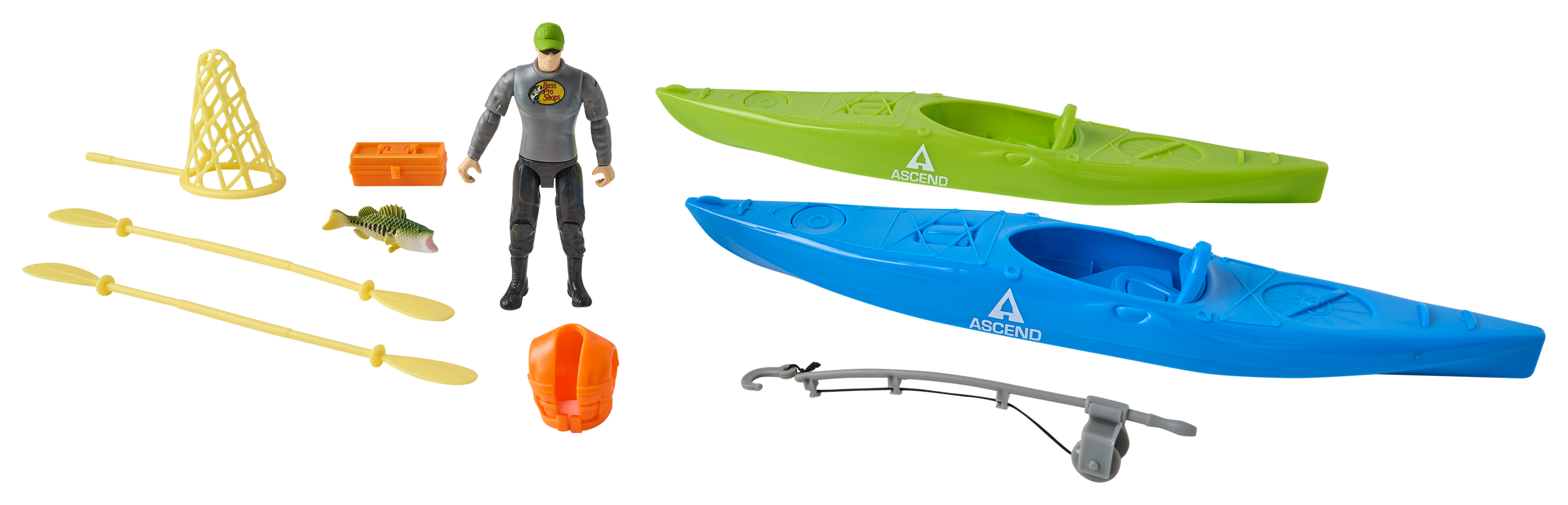 Your little adventurer will love exploring the Great Outdoors with the Bass Pro Shops® Open Range Collection Kayak Playset for Kids. This 10-piece Bass Pro Shops playset includes 2 kayaks, an action figure, a fish, a tackle box, a life jacket, fishing pole, net, and 2 paddles – everything they need for adventures on the water! Recommended for ages 3 and up.