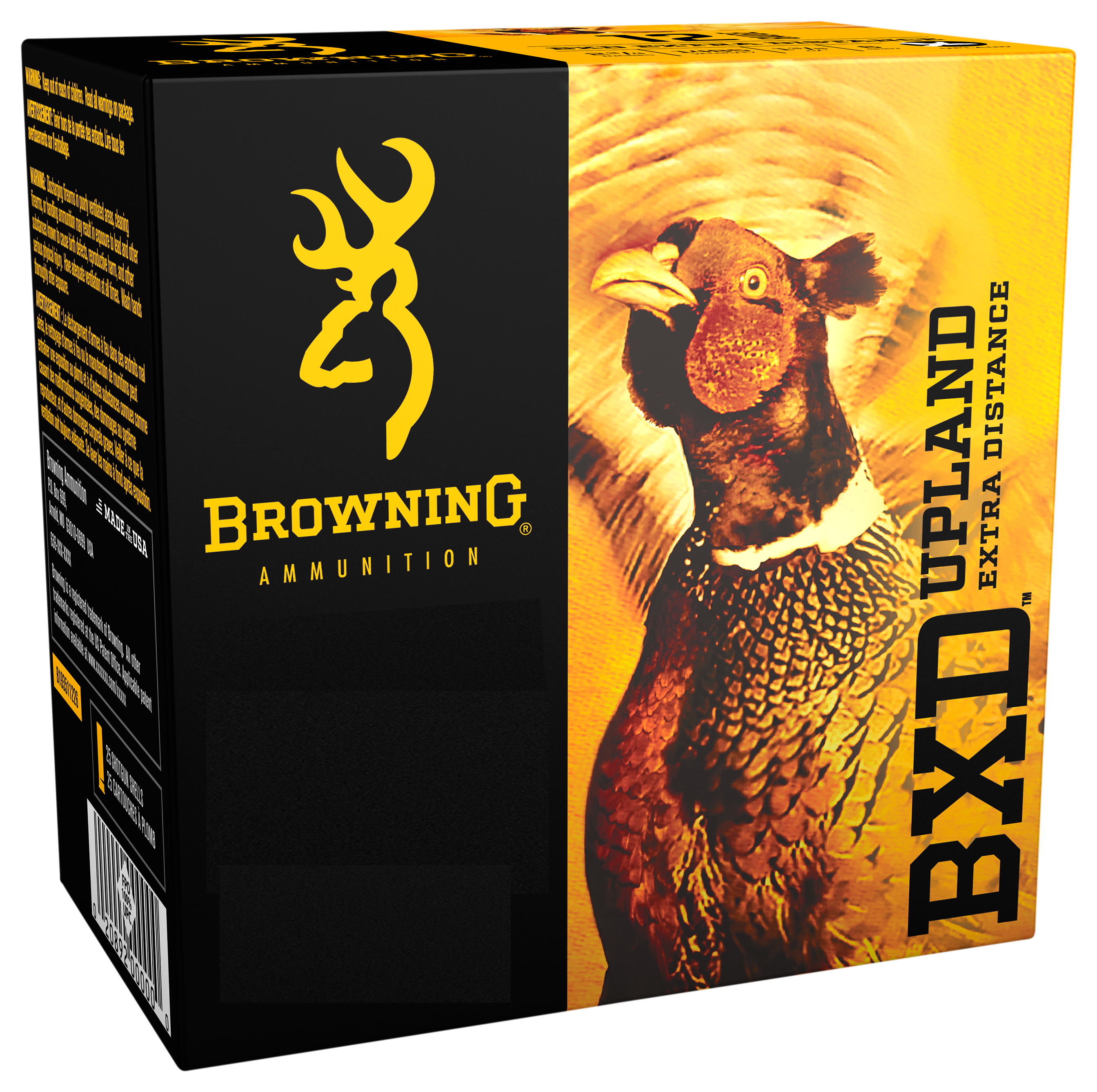 Browning® designed their BXD™ Upland Extra Distance 20-Ga. 3" 1-1/4 oz. Shotshells for serious bird hunters who demand reliable shotgun ammunition that delivers dense, high velocity shot patterns at maximum range. BXD (Browning Extra Distance) Upland features an aerodynamically stabilized wad that releases shot consistently for tight, uniform patterns. The nickel-plated, lead shot is manufactured for ultimate concentricity to fly true and maintain velocity. Each load of BXD is driven at maximum velocity to reduce lead, reach far, and penetrate deep. Browning BXD Upland Shotshells provide that extra distance to make clean kills at ranges where standard upland loads can't reach. Made with clean burning powder, high-brass bases, and quality plastic hulls.