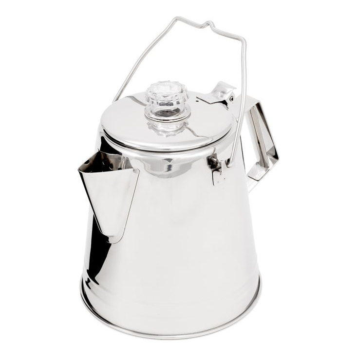 No campsite is complete without one of these coffee pots to heat up your favorite coffee. With a hanger bail and tempered glass percolator top, these conical-shaped pots are made to be heated over an open fire. Each pot is crafted out of tough 18/8 stainless steel with a stainless steel handle and precision-fit, seamless construction to make them durable enough for use in the most demanding remote locations. Includes a two-piece basket percolator system.