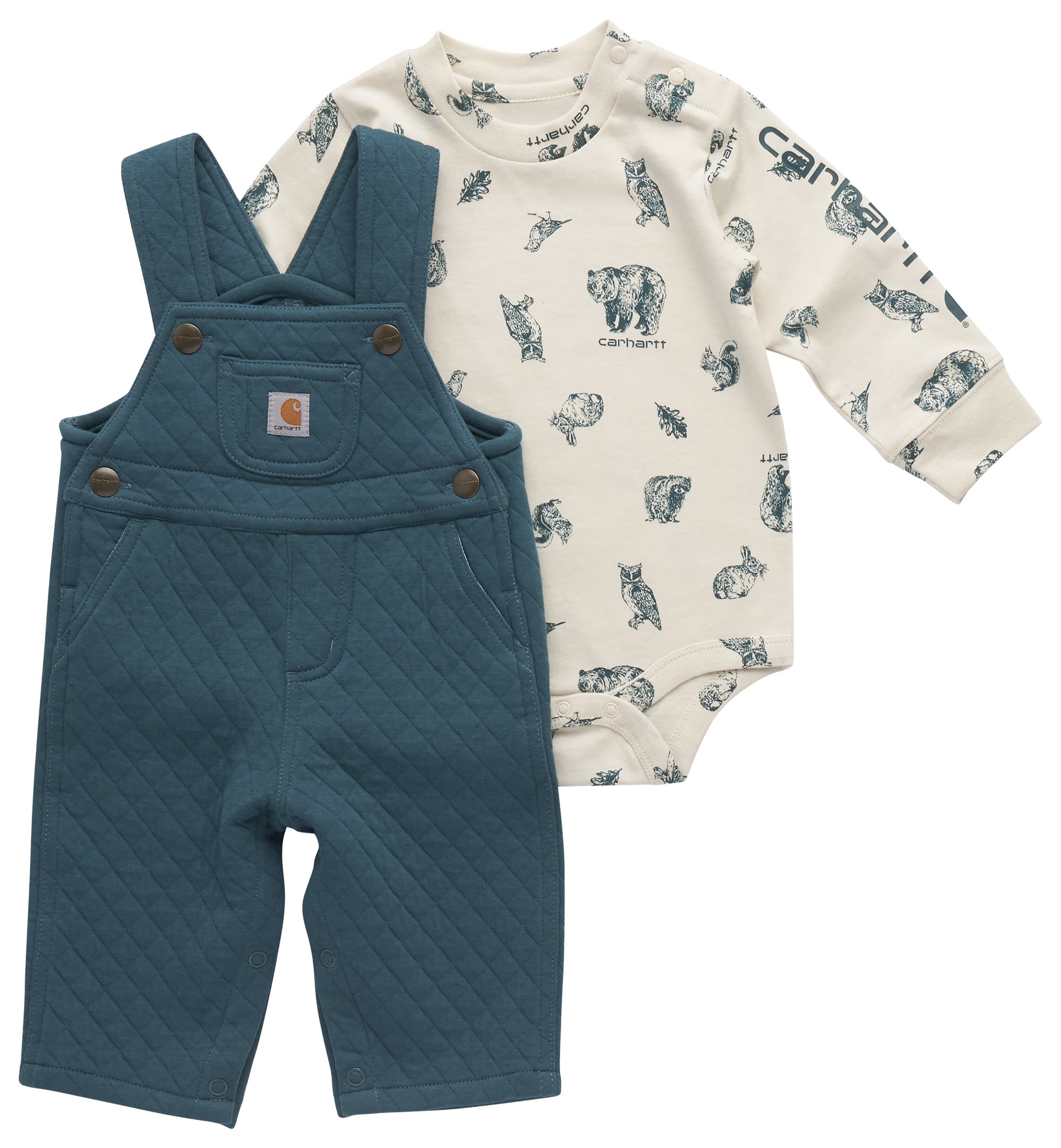 Calling all future forest rangers. The Carhartt® Long-Sleeve Bodysuit and Quilted Overalls Set for Baby Boys brings fun outdoor style. This baby boys' Carhartt overalls set includes a cotton bodysuit in a wildlife print and quilted overalls for a blanket-like feel. Snaps make both pieces easy to take on and off. Machine wash. Imported. Manufacturer style #: CG8996.