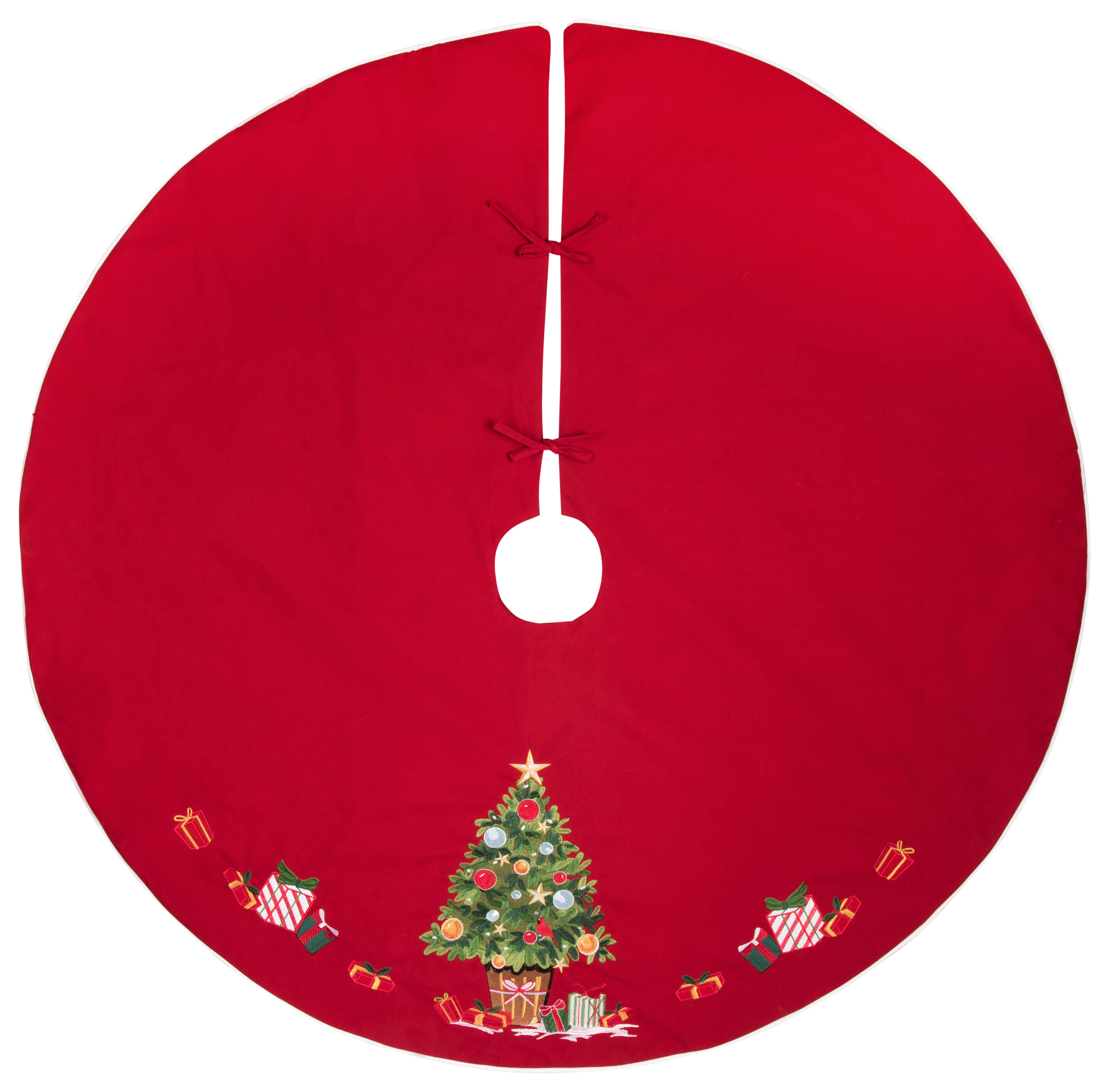 Happy holidays! The C&F Home Holiday Christmas Tree Skirt features the cheerful image of a beautifully decorated Christmas tree and presents on top of a red background. The vibrant colors and playful design make this piece from C&F Home a wonderful holiday decoration. 54"L x 54"W. Made of 100% cotton. Imported.