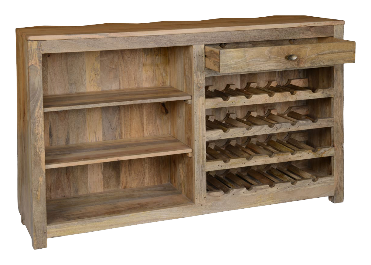 Discover a blend of functionality and artistry with the Classic Home Prism Bar Cabinet. Carved from the luscious mango wood, this piece is an ode to nature's durability and elegance. With its expansive dimensions and detailed construction, the Prism becomes more than just storage—it's a conversation starter. The cabinet's design boasts spacious drawers and fixed shelves, perfect for housing your finest spirits, glassware, and mixology tools. Wine enthusiasts will particularly treasure the dedicated wine storage section, ensuring each bottle is showcased with the reverence it deserves. The hand-finished and distressed finish lends an ageless beauty, reminiscent of heirloom pieces passed down through generations. And, with the plank construction, each grain and groove tells a unique story, further enhancing its rustic appeal. 68"L x 20"W x 42"H. Weight: 206.1 lbs. Imported.