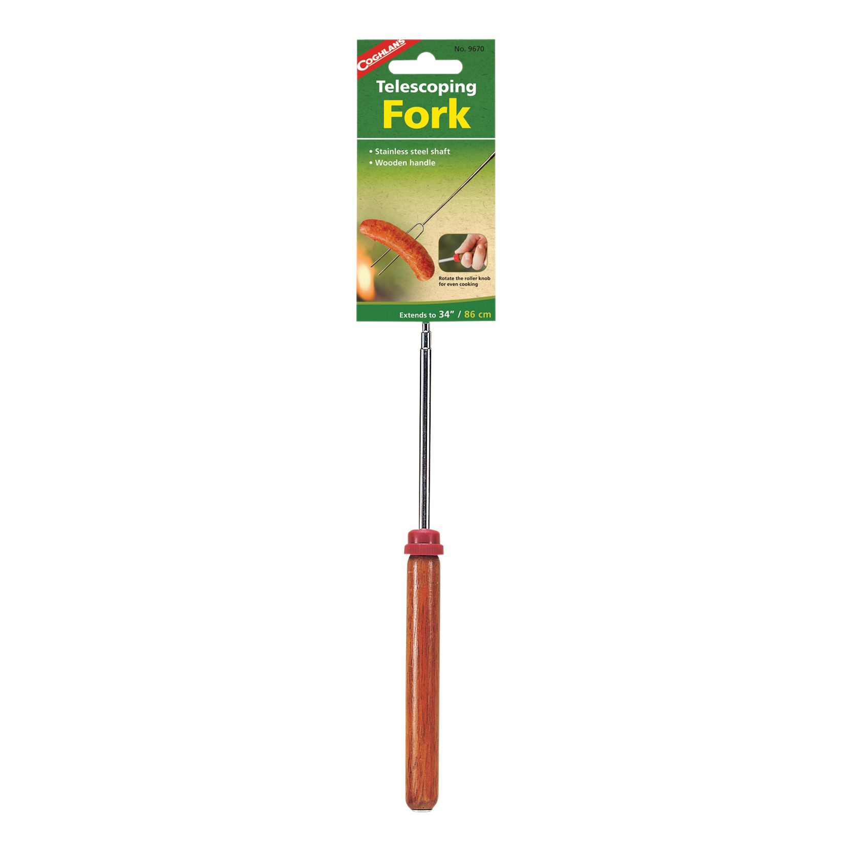 Chrome plated shaft extends to 34" (86cm) Wooden handle with thumb roller rotates food to cook evenly.