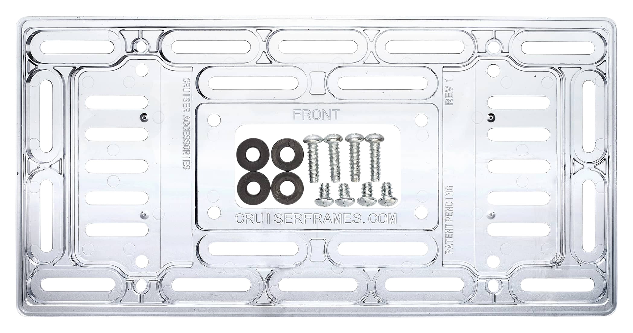 Cruiser Accessories® Universal License Plate Mount features flexible hinges for a universal fit on angled/curve bumpers. Allows mounting a license or novelty plates to a vehicle or trailer. A great alternative to the vehicle's original equipment mounting plate, along with a providing a solution to traditional spacing of license plate mounting holes (traditional spacing is 7"). Spacer provides a way to get license plate up and out from recessed area on rear step bumper. This license mount from Cruiser Accessories is made of durable polycarbonate and backed by a manufacturer lifetime guarantee against cracks and breakage. Includes four #2 Phillips fasteners (1/4" x 3/4"), four #2 Phillips fasteners (1/4" x 5/16"), four clearance spacers (1/8"), and two clearance spacers (5/16"). Easy to install. Instructions included. 6"H x 12"W.