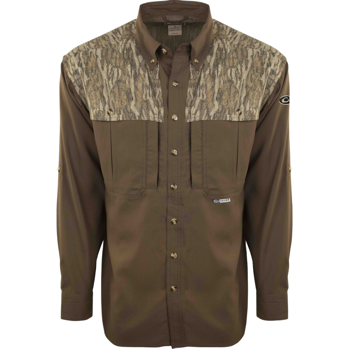 The Drake EST 2-Tone Flyweight Wingshooter Long Sleeve is Drakes lightest and most breathable Early Season hunting shirt, great for dove season and early goose or teal season. An ultra-lightweight 100% polyester construction is designed to dry quickly and wick moisture away from the body. Also contains Sol-Shield™ UPF 50+ sun protection, vented mesh back, a vertical Magnattach™ chest pocket & a vertical chest pocket. • 100% Ultra-Lightweight Polyester Flyweight Fabric • Sol-Shield™ UPF 50+ sun protection Mesh Side Panels & Back • Magnattach™ Vertical Chest Pocket • Zippered Vertical Chest Pocket • Quick Drying & Breathable • Sunglass Holder • Large Chest Pockets • Upper arm buttons for easy short sleeve conversion