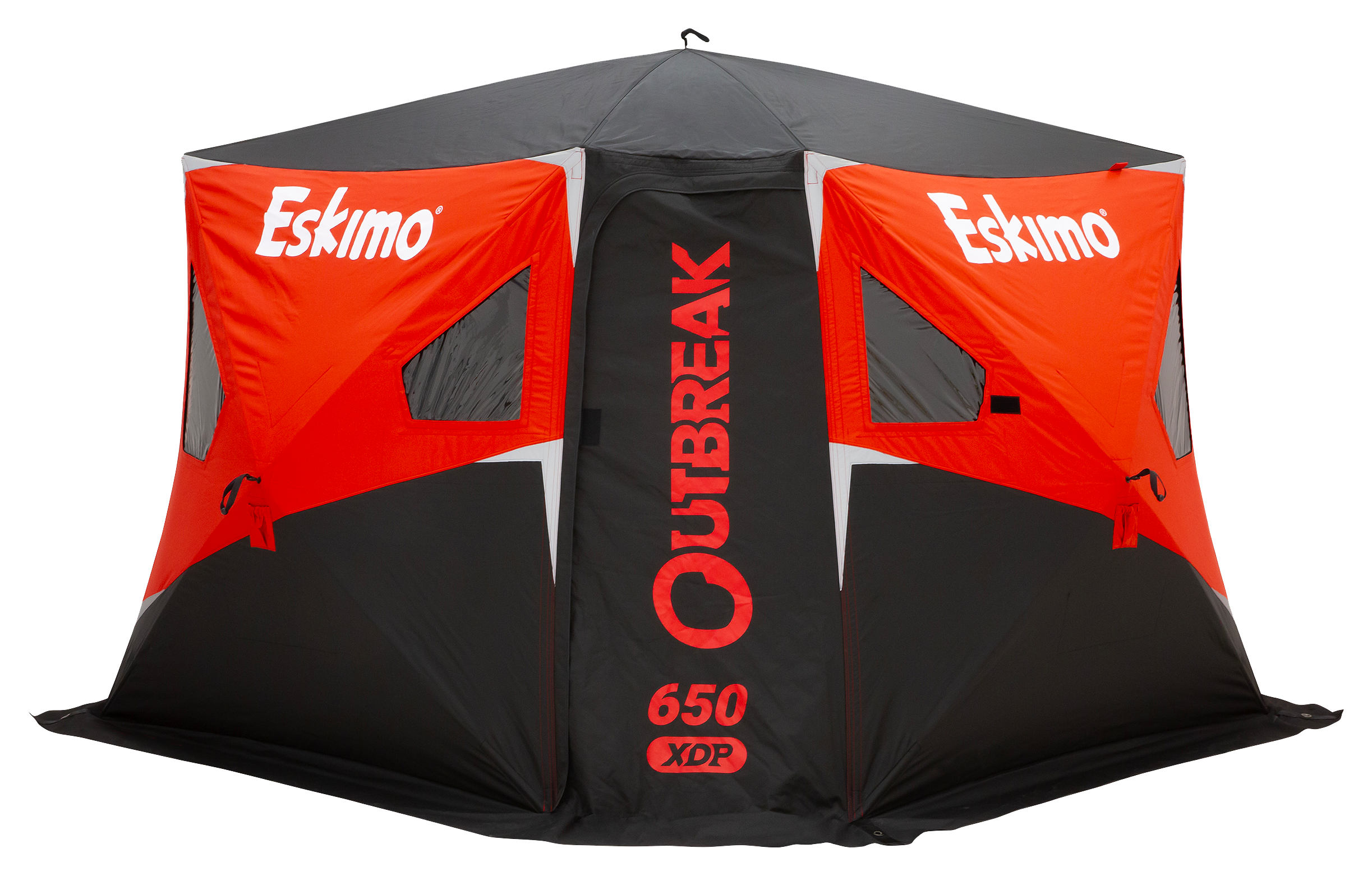 Reconfigured for easier transport and setup, the 6-sided Eskimo® Outbreak™ 650XDP Pop-Up Ice Shelter will comfortably accommodate 5–6 anglers, yet its advanced Packdown™ hub geometry provides a more-compact travel load to perfectly fit a pickup short bed, ice sled, or ATV rack. On the ice, you'll find plenty of fishable space to go along with its reliable warmth, larger windows, and smartly designed HVAC ports. This shelter's optimized hub placement allows for quick setup; the premium StormShield™ high-loft insulated bonded fabric provides the protection you need to fish comfortably, day and night. The built-in zipper port allows you to run an outside propane line or electrical cord to your heater, if desired; the 2 integrated HVAC ports can be used to connect a diesel-fueled heater or for straight ventilation control. Shrug off the heavy outerwear, and enjoy your time on the ice! The main entry is fitted with Eskimo's oversized No-Trip Door design, which opens from ice level for easy travel in and out of your shelter; a standard D-door opposite provides additional access. Upsized extra-large windows feature cover flaps that stow conveniently in attached pockets. Includes 11 ice anchors and 5 deluxe cam-strap tiedowns, one for each hub, for security in windy conditions. Deluxe carry bag features a full-length YKK® zipper with carry strap and additional grab handles, plus pockets for anchors and straps. Set up size: 135" x 143". Center height: 84". Pack size: 66"L x 11.8"W x 11.8"H. Fishable area: 94 sq. ft. Weight: 70 lbs.