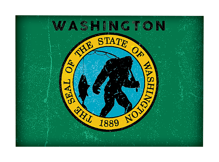 • Features the Washington state flag remixed with Bigfoot and his fishing pole