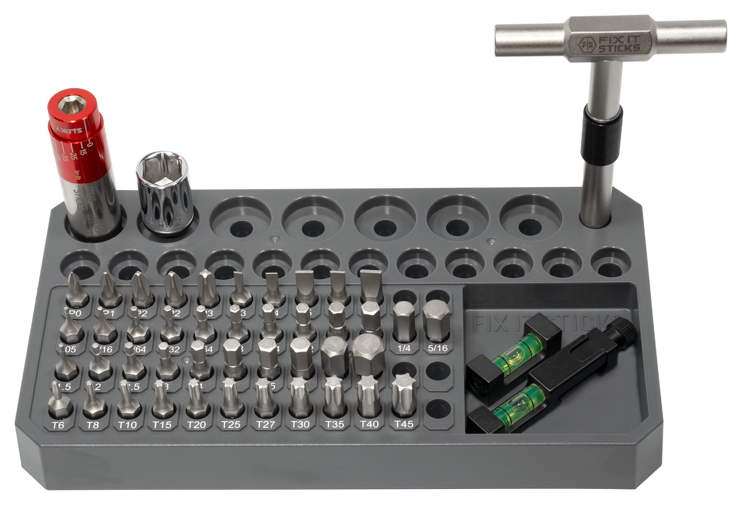 Stay organized for mounting optics with the Fix It Sticks® Benchtop Tool Kit. This bench kit can tackle nearly any fastener you'll come across. It comes with an all-in-1 torque driver; T-Way T-handle driver; 1/2" socket; machined-aluminum bubble level set; NATO/Picatinny rail/anti-cant device and magnetic level; forty-three 1/4" bits; and the benchtop base. The bits include 11 Torx bits (T6, T8, T10, T15, T20, T25, T27, T30, T35, T40, T45); 22 hex bits (1.5mm, 2mm, 2.5mm, 3mm, 4mm, 5mm, 5.5mm, 6mm, 8mm, 10mm, .050", 1/16", 5/64", 3/32", 7/64", 1/8", 9/64", 5/32", 3/16", 7/32", 1/4", 5/16"), 5 Phillips bits (P0, P1, P2, P2, P3), and 5 slotted bits (3mm, 4mm, 5mm, 6mm, 7mm).