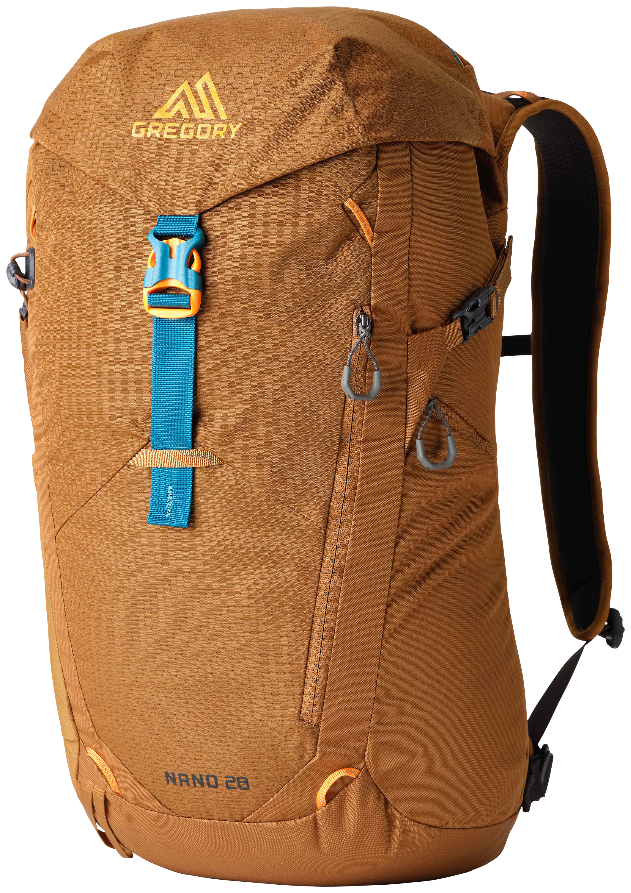 A performance daypack for longer adventures and weekends away, the Gregory® Nano 28 Daypack makes it easy to haul needed gear in comfort. This 28-liter pack offers 1,708 cu. in. of space through its panel-loading main compartment with a large, U zipper for easy loading. A separate zip pocket for a hydration reservoir (reservoir not included) doubles as a sleeve for your tablet or small laptop. The Nano's breathable die-cut backpanel pairs with a padded airmesh shoulder harness to help you carry a full load in comfort. Harness also features a 1-handed sternum strap buckle and hydration routing loops. Dual compression straps with quick release buckles and the removable webbing hipbelt help ensure load stability for easier carrying. This versatile pack also features a quick access zip front pocket with an internal zip mesh pocket and key clip, a zip stash pocket, and dual side stretch mesh pockets. Adjustable attachment loop and upper shock lock lets you haul trekking poles or an ice axe easily. Reflective webbing loops for visibility. Made of a high density 210-denier nylon (40% recycled) and 450-denier recycled polyester with durable water-resistant treatments.
