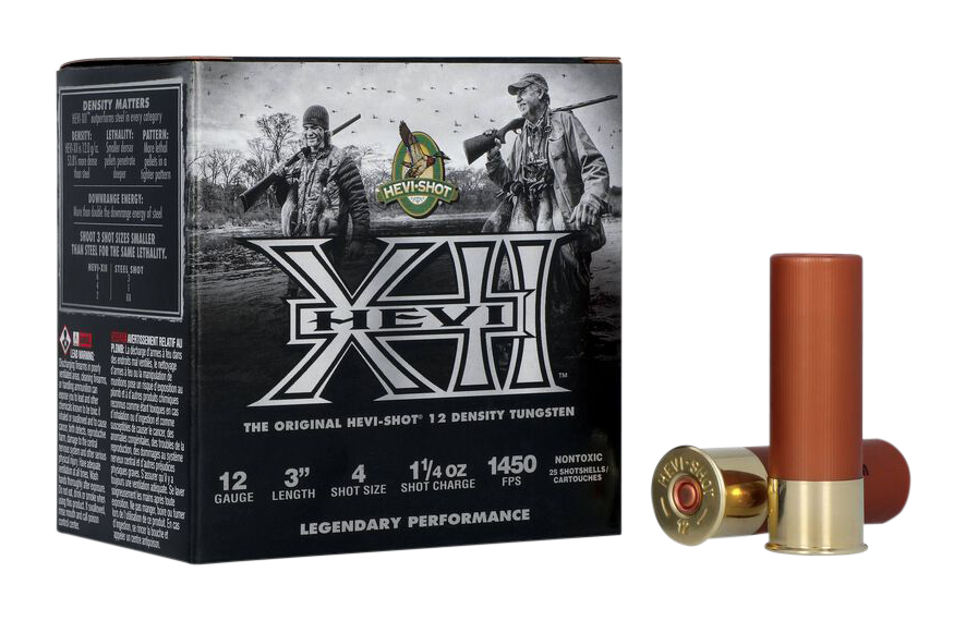 Pack in with Hevi-Shot® Hevi-XII® Original Shotshells and come out carrying extra weight. Loaded with Hevi-Shot's original 12 g/cc tungsten that's 53.8% denser than steel, these loads double the downrange energy, hitting birds harder from a longer distance. This means you can drop three shot sizes for the same lethality and still put 28% more pellets on target.