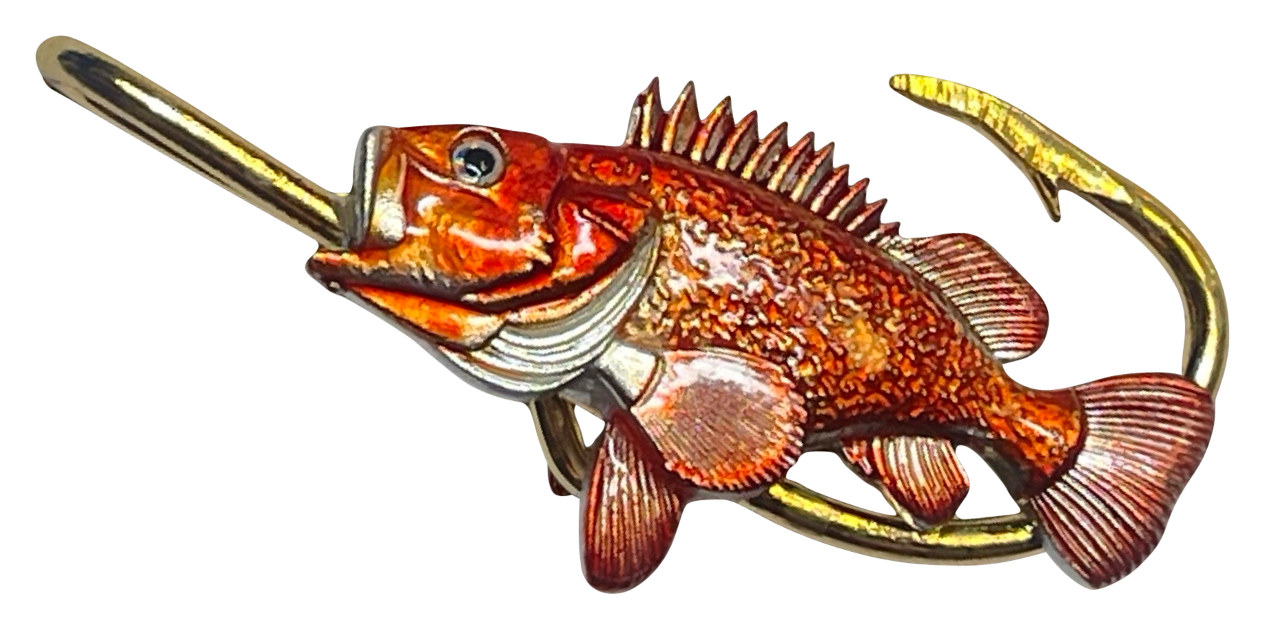 Show off your passion for angling with the Hookits Rockfish Fishing Hook Hat Pin Clip. This handcrafted, hand-painted fishing hook pin showcases the stunning fish made of nickel and cadmium-free pewter. Resin-coated for durability, it stays securely on a gold-plated eagle case hat hook. It also looks great as a money clip or tie clip.