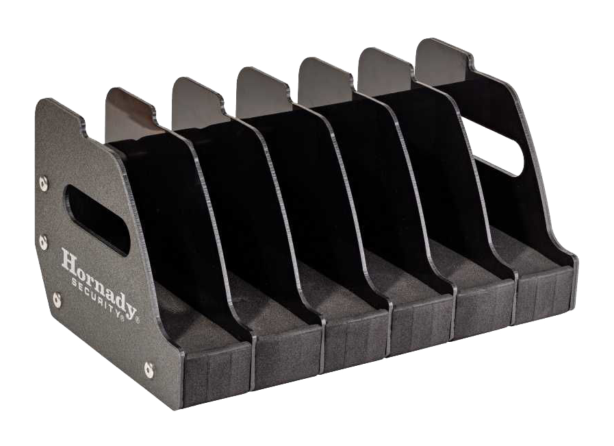 The Hornady® 6-Gun Pistol Storage Rack provides simple organization for your gun safe. The high-density foam base and polymer dividers protect your handguns, while the thick metal side plates provide strength and rigidity.