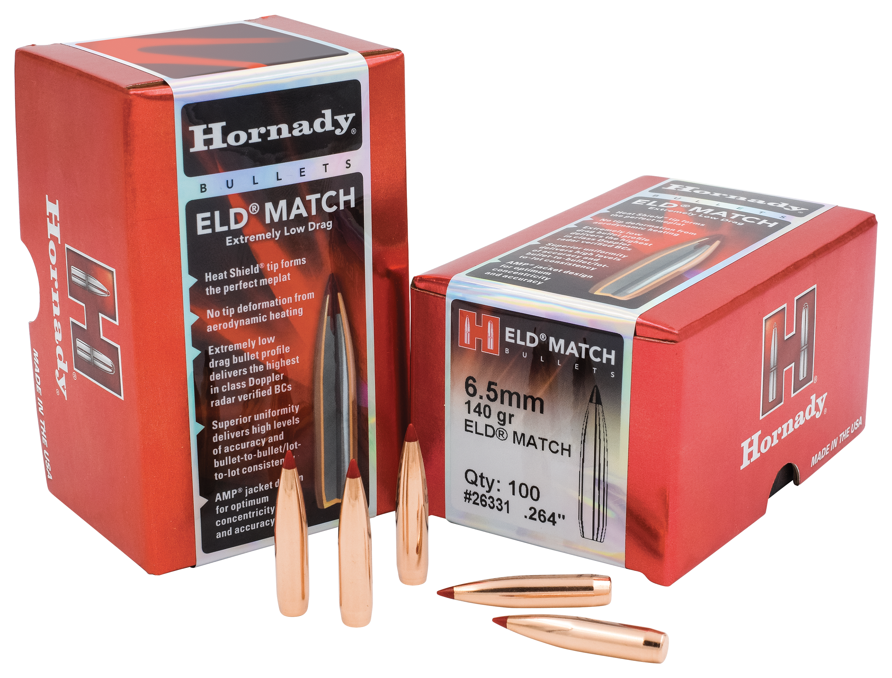 Hornady® ELD Match™ Rifle Bullets deliver extremely high ballistic coefficients, superior accuracy, and maximum consistency for ultra long range shooting. To counter the effect of heat deformation to polymer tips, Hornady developed the Heat Shield™ tip, made from heat-resistant polymer, which maintains the bullet's aerodynamics to flatten trajectories and reduce wind drift for the ultimate in long-range accuracy. ELD (Extremely Low Drag) rifle bullets are manufactured with AMP® (Advanced Manufacturing Process) bullet jacket technology and precision swaged lead cores for absolute consistency. A secant ogive and optimum boattail design further enhance the bullet's streamline, aerodynamic shape to reduce drag.
