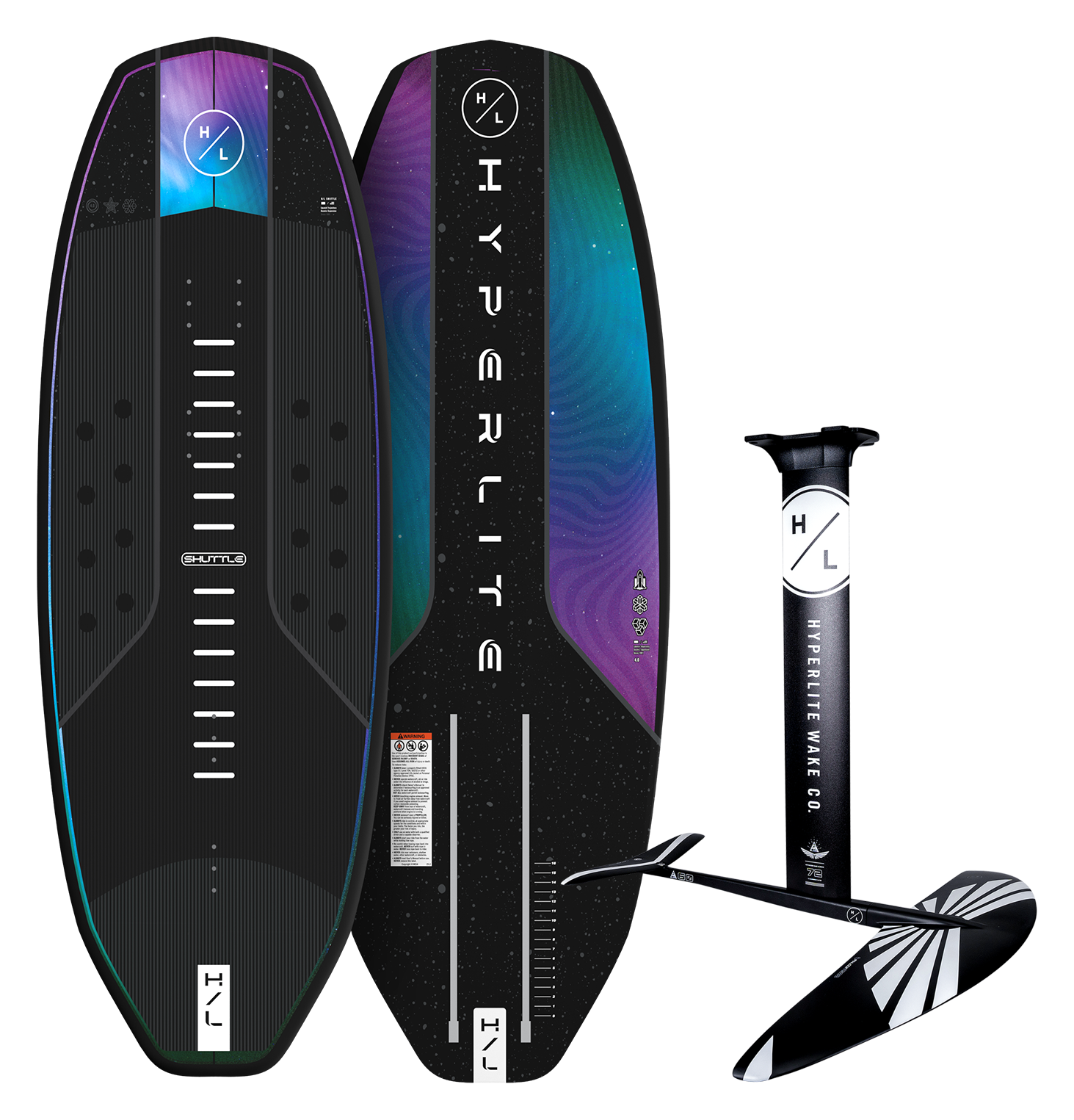 The Hyperlite® 4.0 Shuttle with Falcon Foil Kit makes wake foiling approachable and fun for riders of all levels. Designed with input from Shaun Murray, the 4.0 Shuttle foil board features a shorter length with plenty of volume in the nose, helping you learn proper weight placement. Compression-molded construction adds durability and neutral buoyancy. This Hyperlite board boasts a concave deck that enhances edge-to-edge response, while the machined EVA deck pad provides reliable grip. Adjustable foot-strap inserts allow you to add straps. Paired with the Falcon Foil Kit, this setup offers exceptional lift, balance, and stability behind a wide range of wakes. The Falcon 1200 front wing glides smoothly and efficiently, while the Falcon 235 rear wing adds confidence-inspiring stability that benefits both beginners and experienced riders. A new foil track with placement markers maximizes adjustability.
