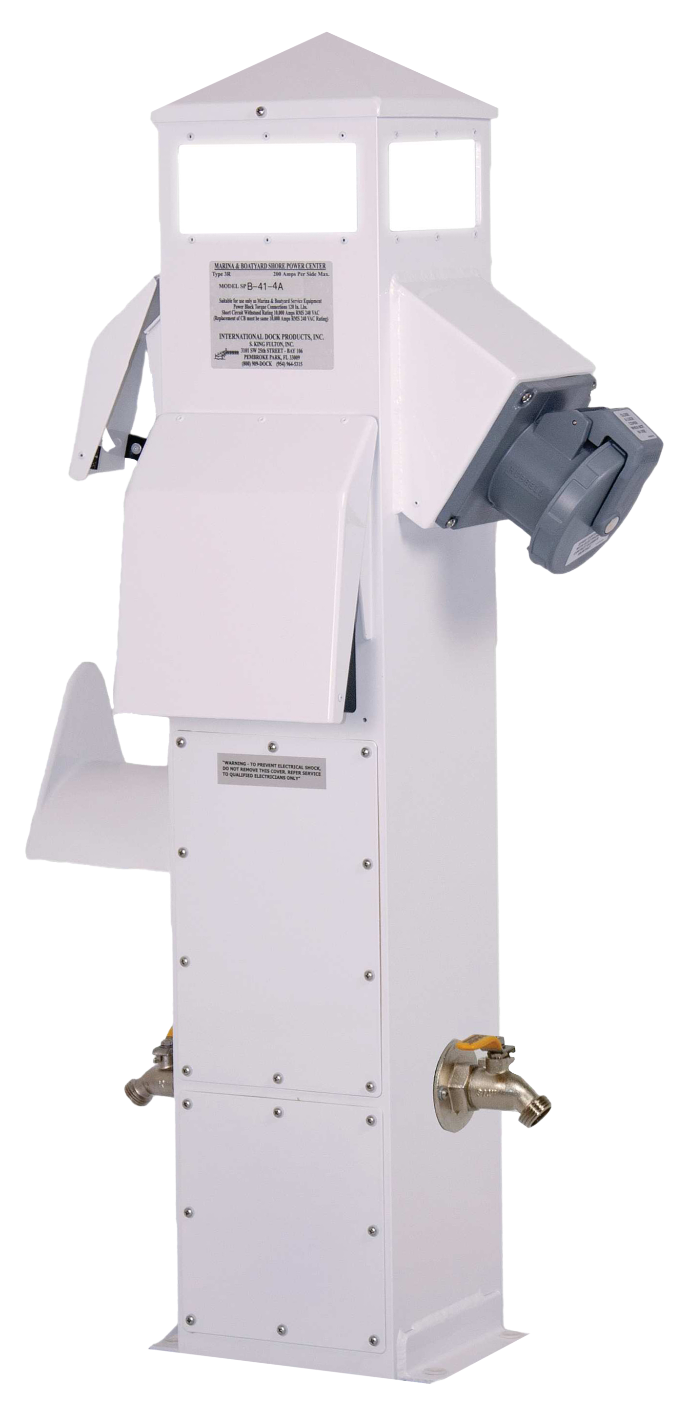 Install the International Dock Products 41" Aluminum 100/50/30/20-Amp Power Dock Pedestal near your boat launch area, and it will supply easy-access electricity and more. This all-aluminum construction comes equipped with an LED light, and 2 water faucets and 1 hose holder make it even more useful. Each electrical receptacle is protected by an individual circuit breaker, and all are mounted at a 45° down-angle and backlit for ease of use. This electrical pedestal box from International Dock Products boasts stainless steel hardware and a white, powder-coated finish. 41"H x 8"W x 8"D.