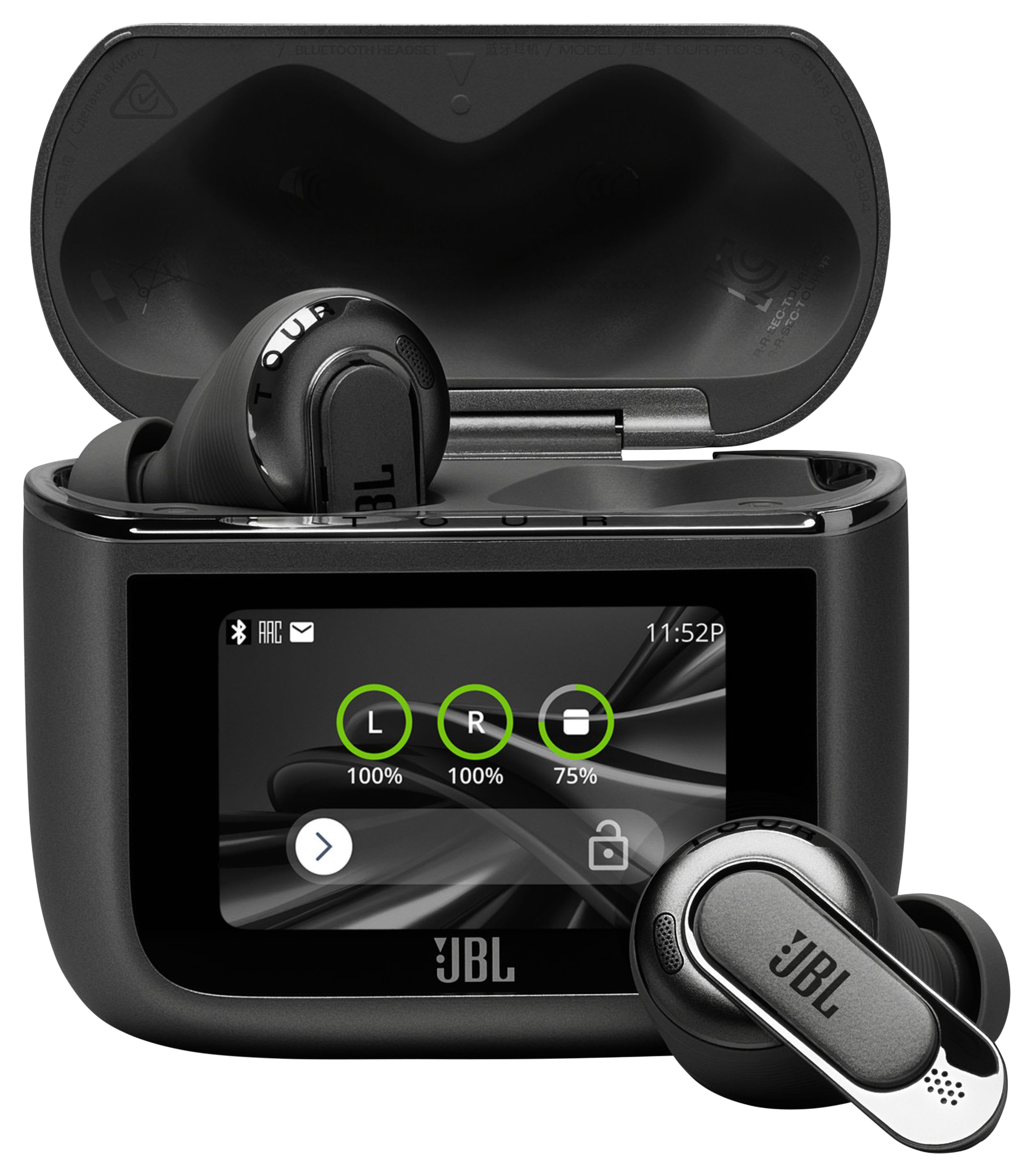 Get ready for the smartest True Wireless earbuds yet with JBL® by Harman Tour Pro 3 Wireless Noise-Cancelling Earbuds with Smart Charging Case™. Tour Pro 3 earbuds come in a newly redesigned Smart Charging Case with a handy and more feature-packed touch screen, giving you full control over your listening experience while your phone stays in your pocket. Connect seamlessly with any Bluetooth® device, and immerse yourself in your music, movies, and games with JBL Spatial 360 sound with head tracking. JBL Tour Pro 3 earbuds also bring legendary Hi-Res JBL Pro Sound. When it's time to work, tune out the world with Real-Time True Adaptive Noise Cancelling. On a flight, use the Smart Charging Case as an audio transmitter dongle to wirelessly connect to the inflight system or PC and enjoy cinematic sound experience while you're in the air. Or at your desk, easily connect the Smart Charging Case to your computer, for perfect call quality. It's sound, like you've never heard it before.