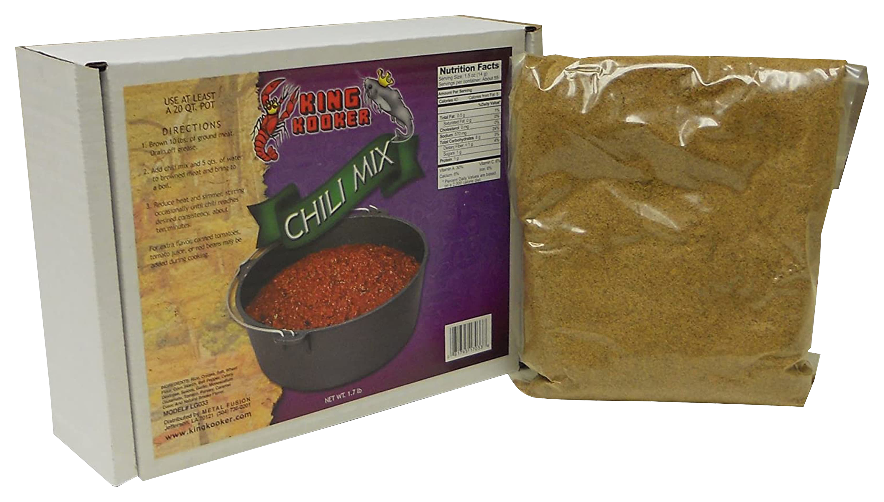 Wanting to fix a batch of great tasting chili for a large group? It's in the bag with a box of King Kooker® Party Size Chili Mix. This blend of spices and seasonings from the experts at King Kooker helps you deliver a big batch of delicious chili in just minutes. Designed to season up to 10 lbs. of the meat of your choice along with your other favorite chili fixings, this 1.7 lb. bag helps you fix enough chili to make 45-60 servings. Sized just right for cooking in a 20-qt. cast iron pot (not included) or comparable pot.