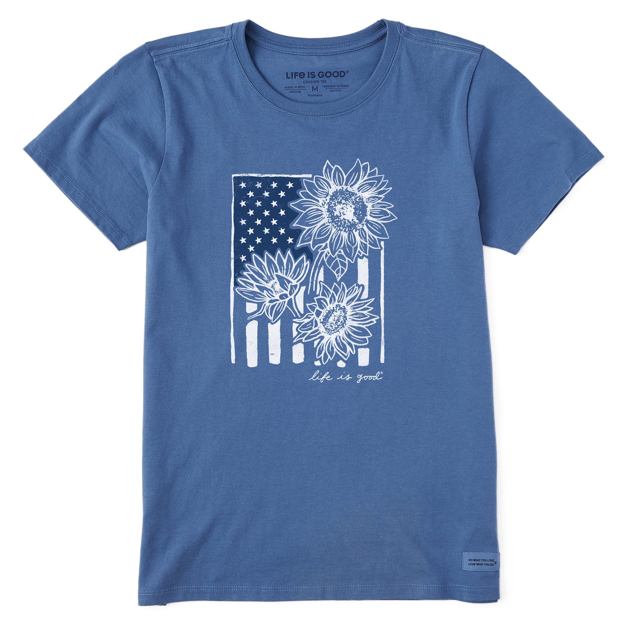 Enjoy some soft comfort with your subtle patriotism in the Life is Good® Sunflower Flag Crusher Short-Sleeve T-Shirt for Ladies. The lightweight 100% cotton construction is garment-washed for skin-pleasing softness, while the printed graphic front and center features sunflowers on a stylized American flag background. This Life is Good shirt has a slightly shaped waist that provides the fit you love, and self-fabric taping across the shoulders deliver a bit of extra durability. This women's shirt has a cotton/spandex ribbed neck that keeps its shape without slouching or folding. The Life is Good Sunflower Flag Crusher Short-Sleeve T-Shirt for women is made with cotton grown in the USA. "Do what you love. Love what you do.®" locker patch. Machine wash. Imported.