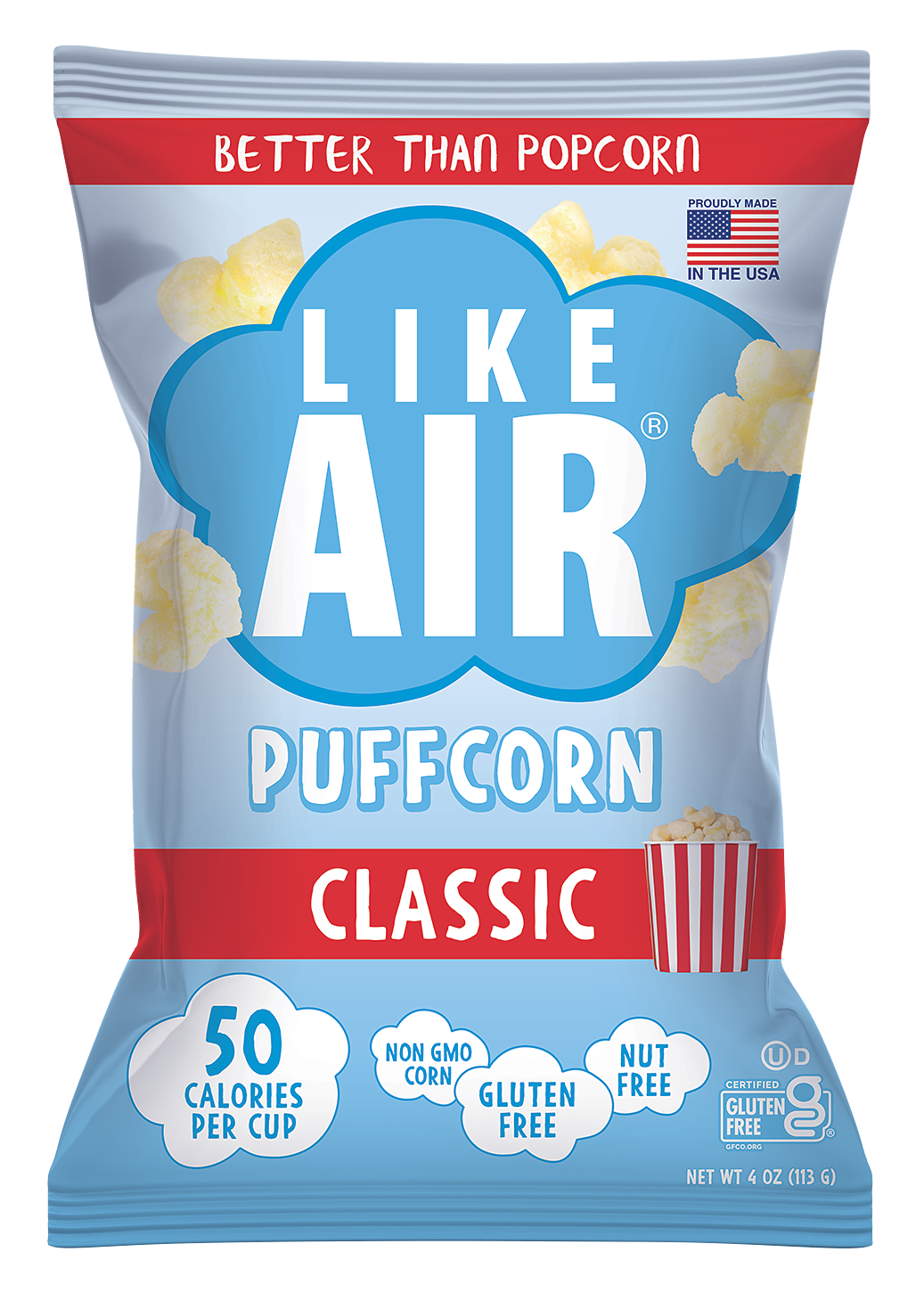 Keep snack time light with the Like Air Classic Puffcorn! Bursting with buttery goodness, this melt-in-your mouth snack tastes just like popcorn that you'd get at the movie theater, but without hulls, kernels, or artificial ingredients.
