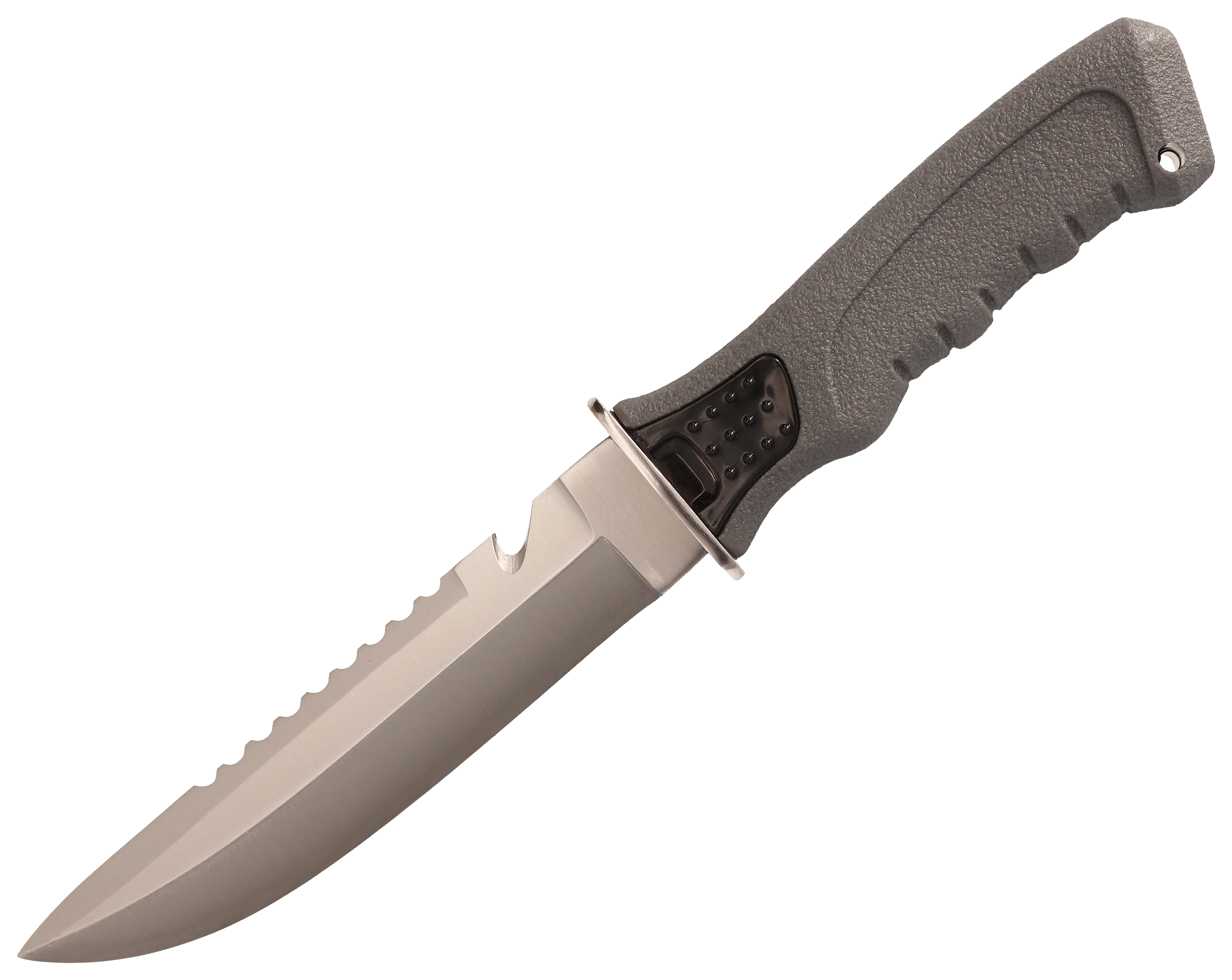 The Marine Sports Stainless Steel Dive Knife with Sheath provides peace of mind on your dives. A super-sharp 420 stainless steel blade is serrated on top, providing tons of utility. The plastic sheath has 2 rubber straps and roller buckles for security. Blade length: 5.5".