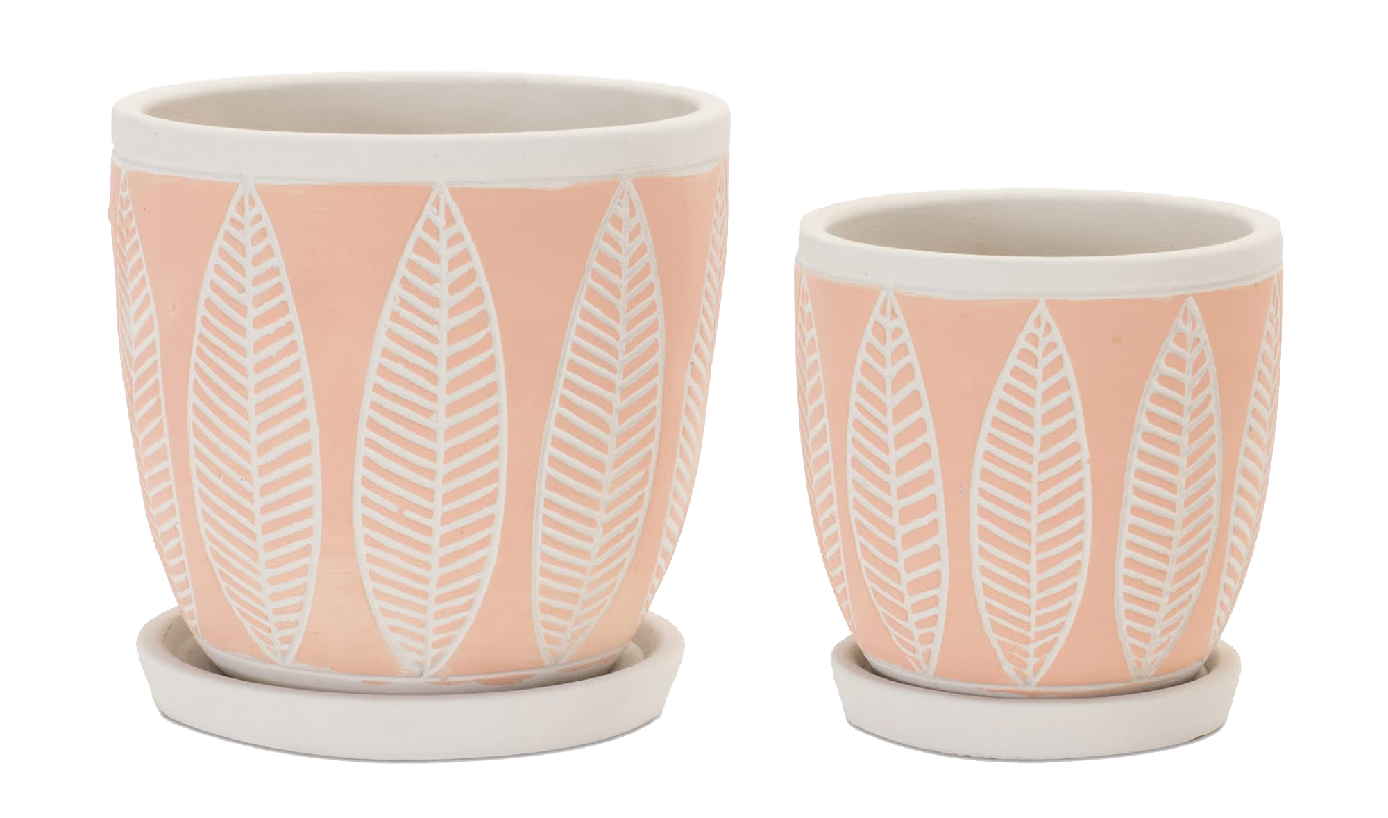 Display your indoor plants in style with this beautiful set Melrose Stone Planters with Plates. Featuring 2 sizes, the soft pink and beige finish paired with the modern leaf print design is the perfect combination to create a memorable display. The cement and sandstone construction is sure to last for years. Add a group of potted plants and succulents to the planters to complete the look. Each pot comes with a matching saucer. Larger pot: 5.5"dia. x 5.5"H. Smaller pot: 4"dia. x 4.5"H.