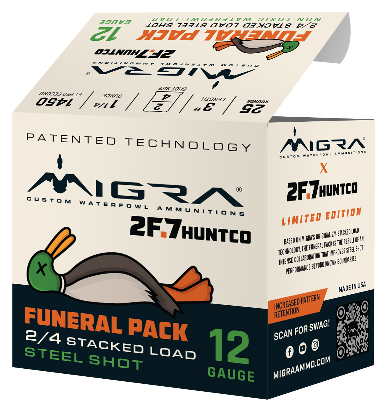 Built around Migra®'s Stacked Load technology, Migra 2F.7 Funeral Pack Stacked Load Steel Shotshells combine #2 steel stacked over #4 steel for lethal impact and energy. New Low-Friction Wad (LFW) technology improves pattern density while concentrating pellet count at the center of the pattern. 12-gauge loads feature the Negative Degree Primer (NDP) that's tested to –40°F for reliable ignition in the coldest weather.