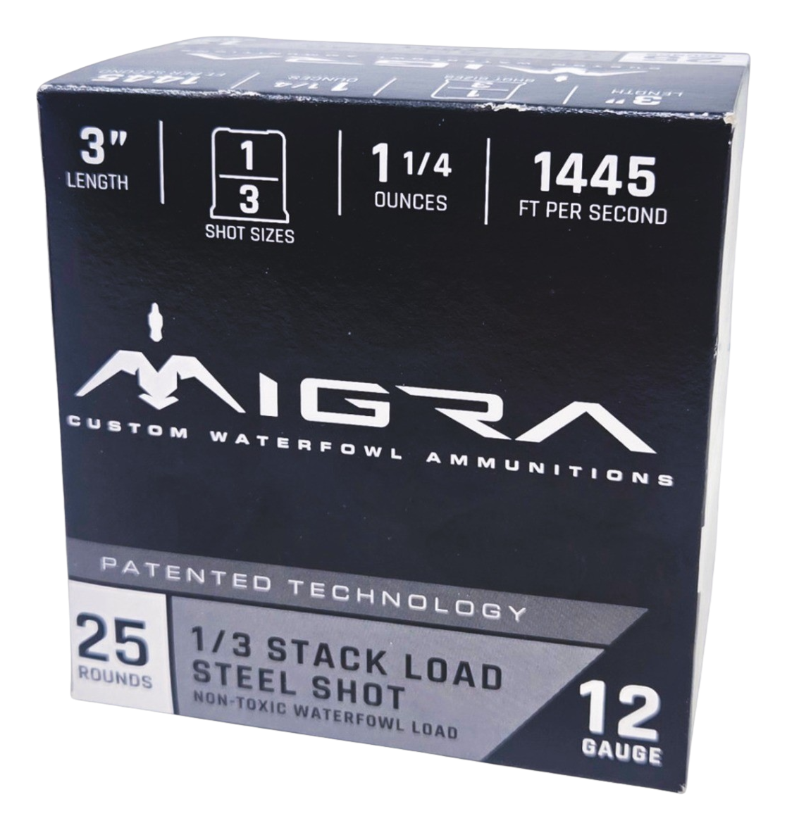 Migra® Stack Load 12-Ga. 3" 1-1/4 oz. Shotshells combine different shot sizes tailored to various waterfowl needs. Stacked loads offer enhanced pattern consistency and shorter shot strings to hit harder than other steel shotshells. Migra ammo is made in small batches to ensure uniformity and high-quality production in each shell.