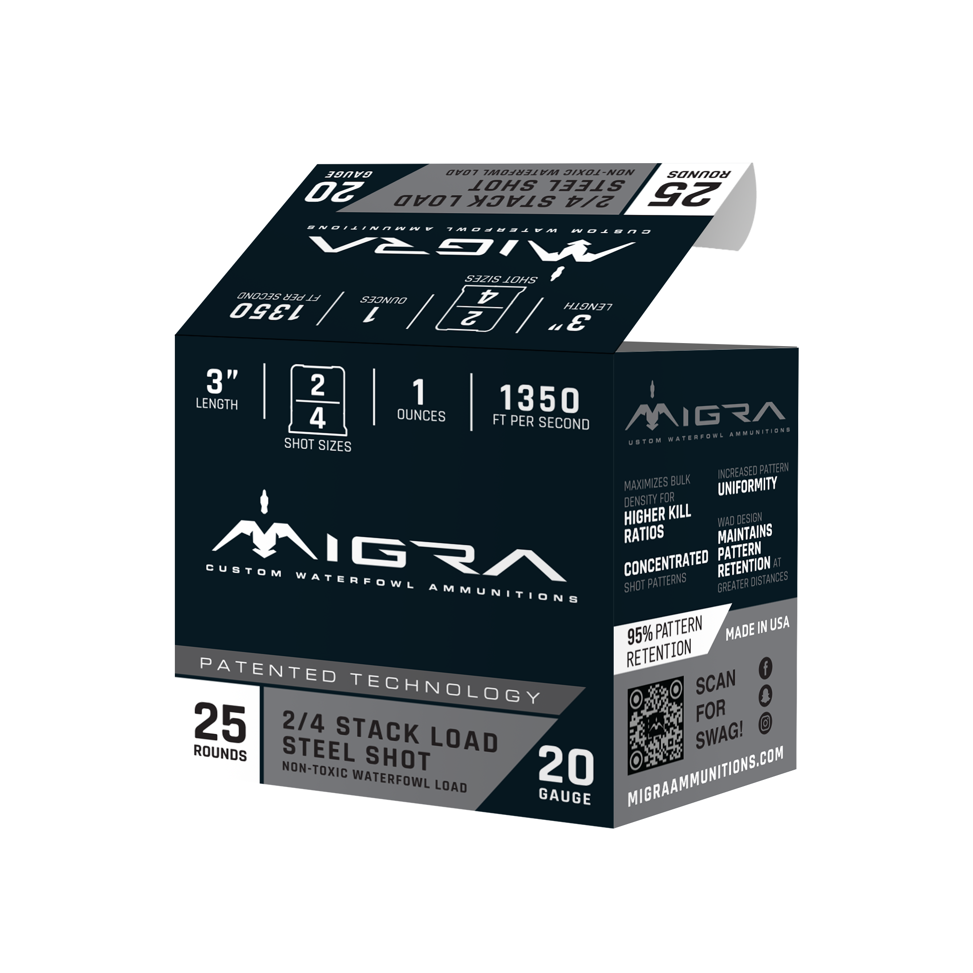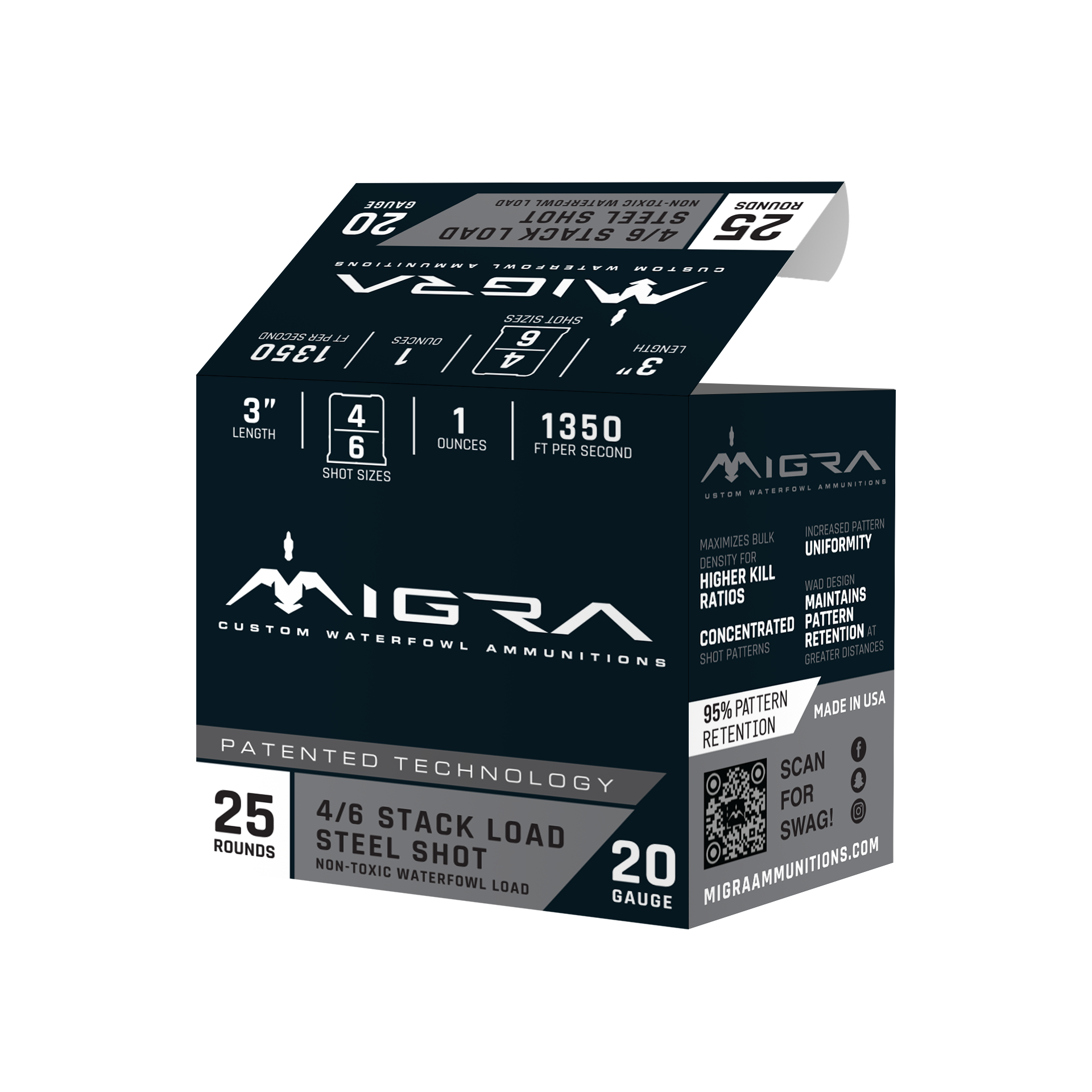 Migra® Custom Waterfowl 20-Ga. 3" 1 oz. Shotshells combine different shot sizes tailored to various waterfowl needs. Stacked loads offer enhanced pattern consistency and shorter shot strings to hit harder than other steel shotshells. Migra ammo is made in small batches to ensure uniformity and high-quality production in each shell.